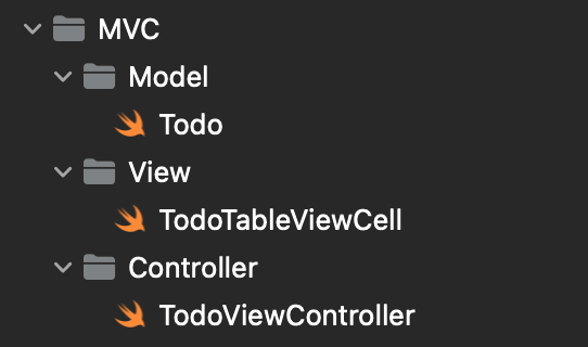 기본적으로 데이터를 담고 있을 Model, 그리고 테이블 뷰 안에 들어있는 Cell은 View, 그리고 테이블 뷰를 포함하는 큰 ViewController로 나뉘어진다. (테이블 뷰는 사실 별도의 View로 분리해야 하지만, 결국 Datasource와 Delegate를 ViewController에서 선언해야 하기 때문에 분리하지 않고 사용하는 셈이다.)