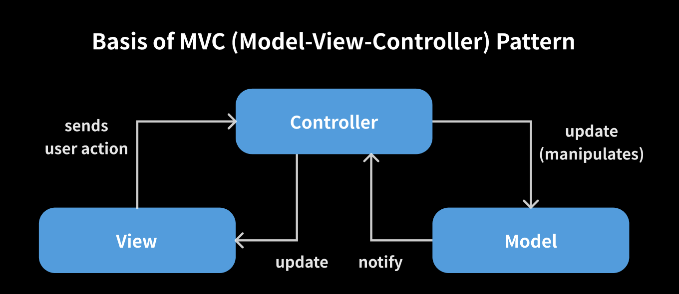 View로 들어온 요청을 Controller로 전달 (user의 action이 들어왔다고 Controller에 알리는 것) -> Controller는 Model에서 바뀐 데이터를 반영 -> Model은 Controller에 데이터의 변경사항을 알림 -> Controller는 바뀐 데이터에 맞게 View 업데이트 순으로 진행이 된다.