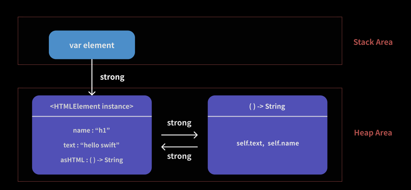 (HTMLElement 인스턴스 RC 분석 : element의 강한 참조 +1, () -> String 타입의 클로저가 갖고 있는 강한 참조 +1, element nil 선언 -1)