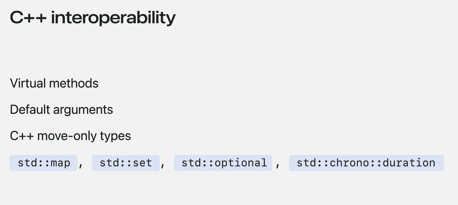 올해 Swift 6에서는 여기서 더욱 발전되어 가상 메서드 (Virtual methods), 기본 인수 (Default arguments), C++ 표준 라이브러리 유형 등을 Swift로 직접 가져올 수 있게 되었다고 한다.