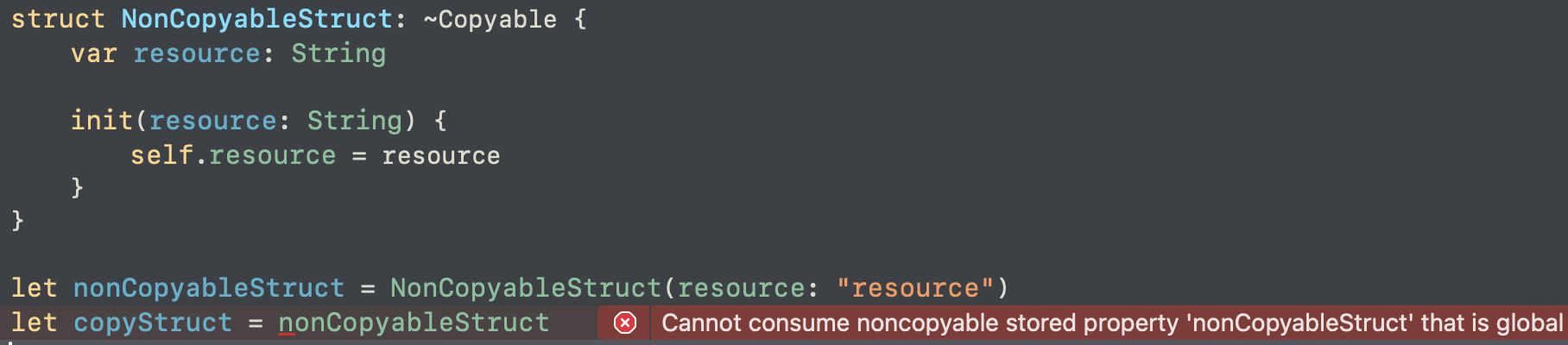 아래를 살펴보게 되면, NonCopyableStruct 구조체는 Noncopyable 타입으로 선언되어 있기 때문에 nonCopyable 객체를 복사해서 copyStruct에 사용하고자 하는 경우 에러를 발생시키는 화면에 해당한다.