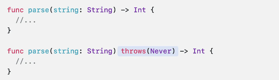 아무런 에러를 보내지 않는 함수는 Never를 throws하는 Typed throws 방식과 같은 의미로 볼 수 있다는 것.