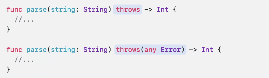 그러니까 기존에 throws 방식의 에러 전파(Error propagate)는 Typed throws 방식에서 (any Error) 타입을 지정해서 던지는 것과 같은 의미였으며,