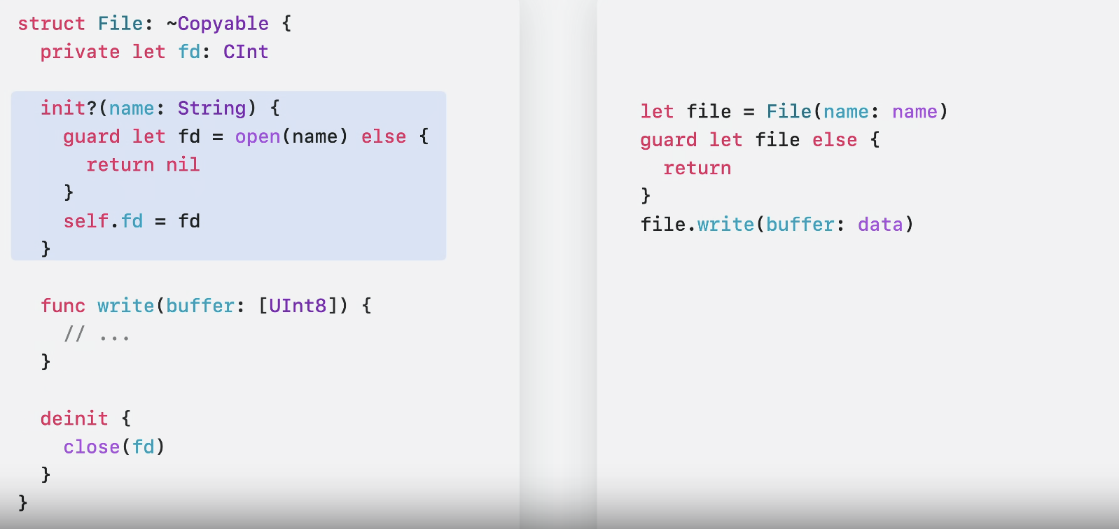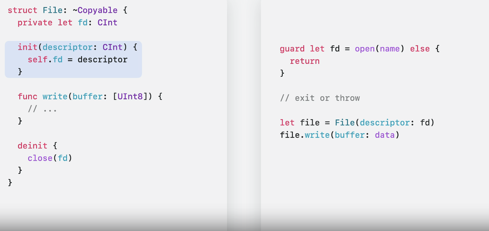 그 이유로 만약 파일을 열고 초기화 하는 코드 사이에 프로그램을 종료하는 코드(exit 또는 throw와 같이)를 삽입하게 된다면, 해제자(deinit)이 실행될 수가 없어 메모리 누수가 발생할 수 있다는 것이다.