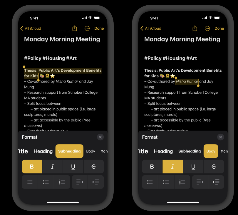 *아래 화면과 같이 메모 앱에서 Sheets 화면을 닫지 않고도 텍스트를 선택하거나 적용하는 것을 동시에 진행할 수 있는 것은 non-modal로써 동작하는 Sheets의 대표적인 사례이다.