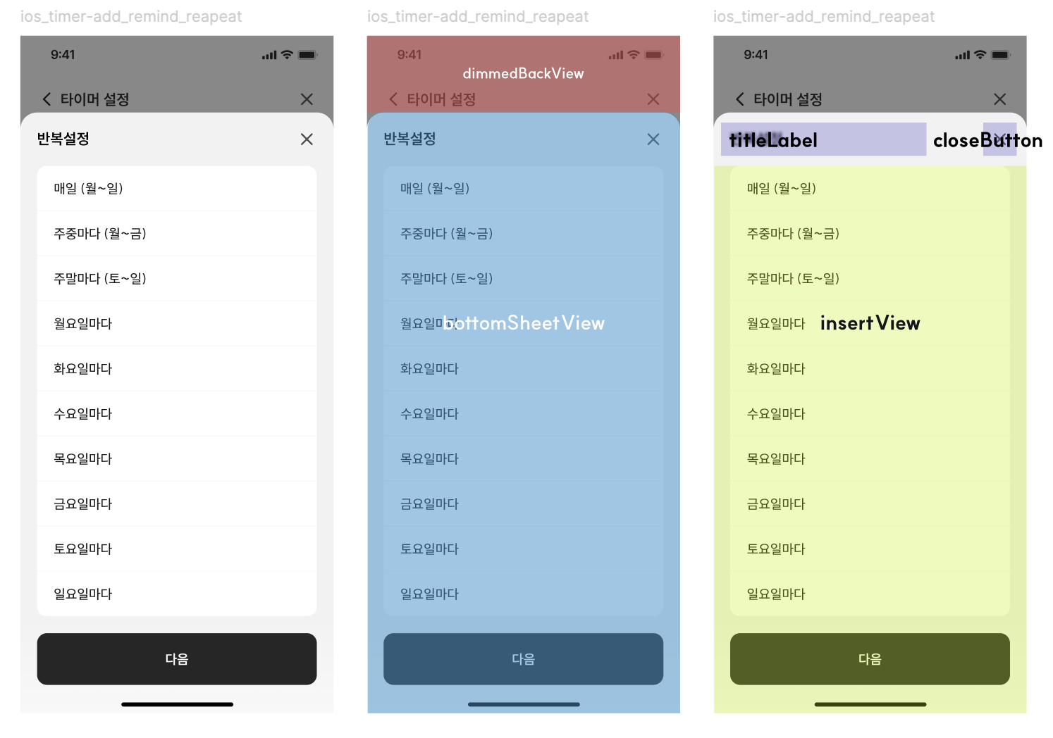 이후, bottomSheetView 안에서는 titleLabel과 closeButton을 공통으로 사용하기로 했으니 공통 부분에 미리 만들어두고, 실제 각 화면마다 달라지는 내용(insertVIew)을 개별적으로 구현해서 추가하는 방식을 생각했다. (아래 2번 -> 3번 화면에 해당)