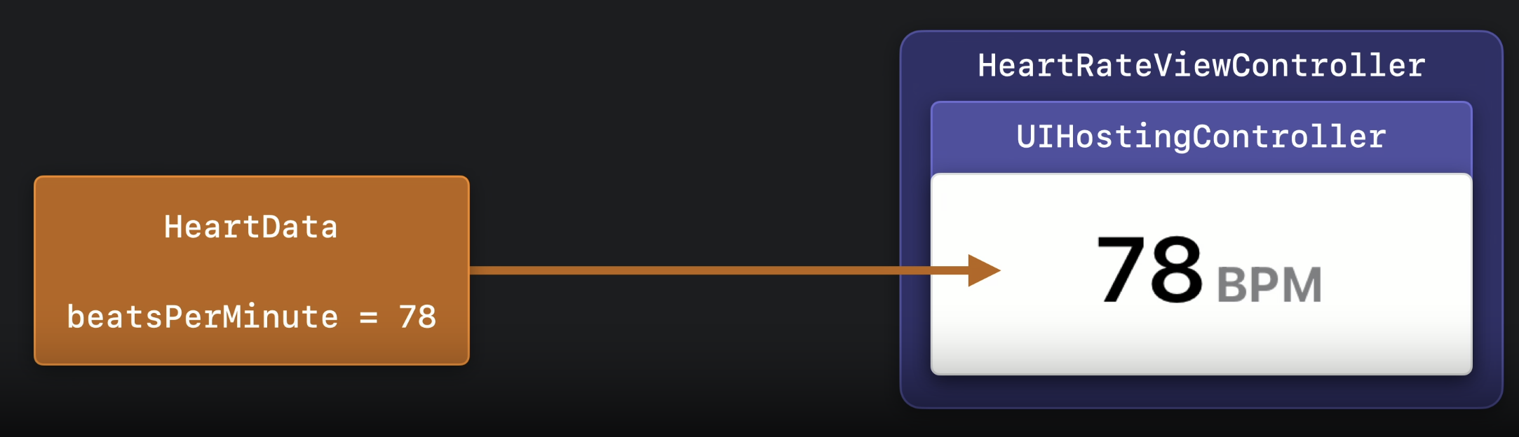 이 데이터를 기반으로 View 안에 있는 Text에 beatsPerMinute(분당 심박수) 프로퍼티에 접근해 표출시킨다.