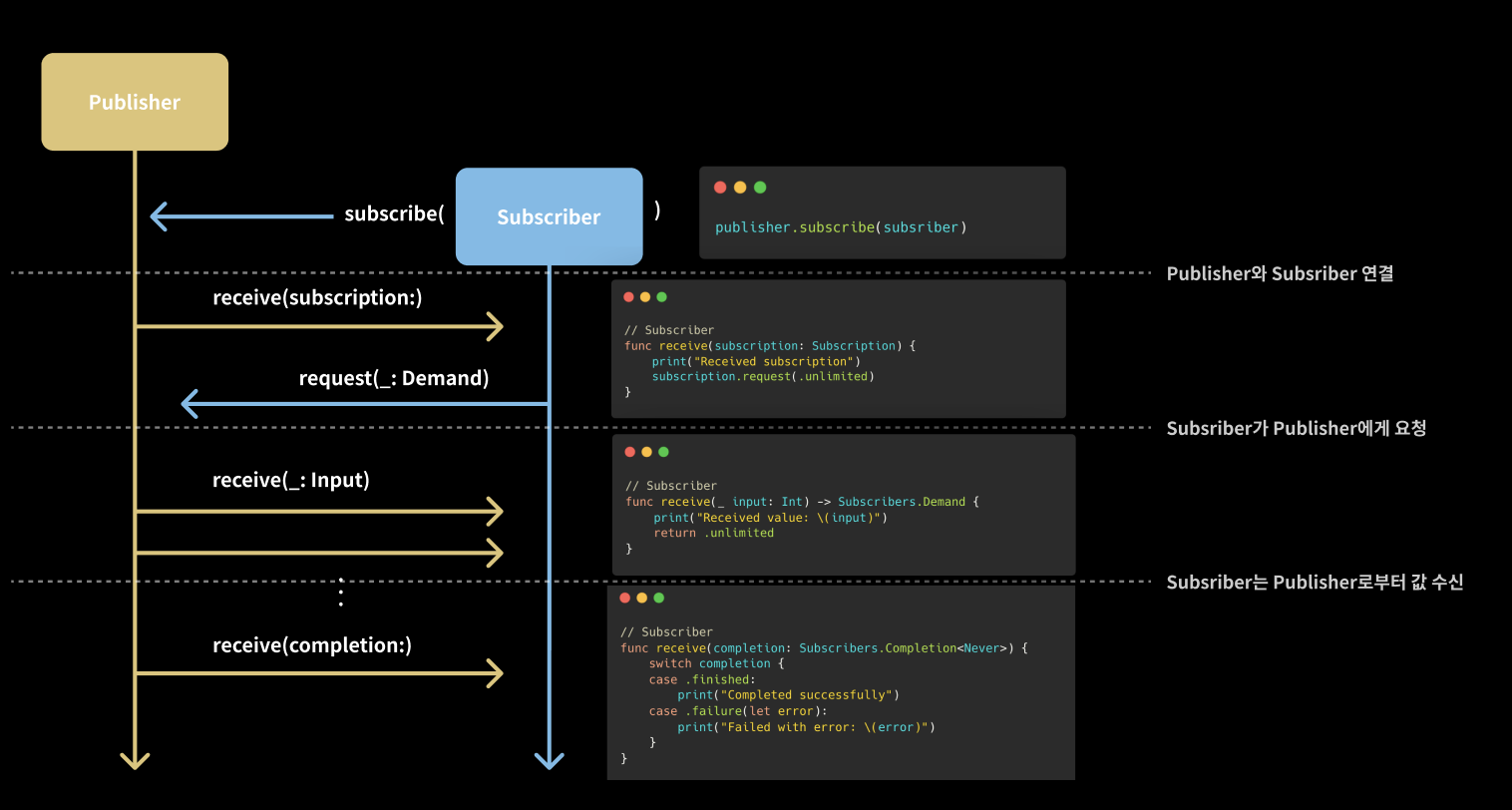 첫 번째 receive(subscription:)는 Subscriber가 Publisher에게 구독을 등록한다는 메서드 subscribe(_:)를 호출한 후 Publisher가 이에 대한 회신의 개념으로 호출하는 메서드다.