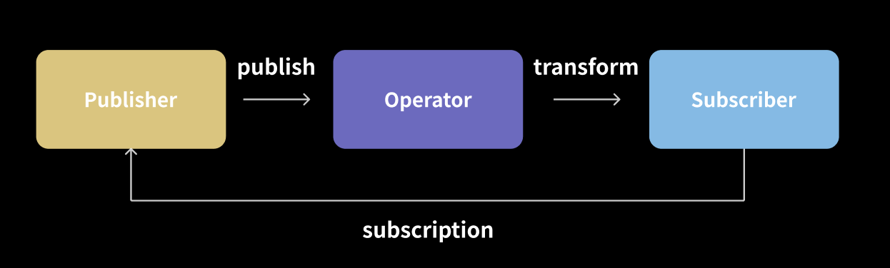 💡 Publisher라는 애가 어떠한 형태로 값을 publish 하게 될 거고, 이 값이 Operator를 통해 원하는 형태로 가공된 다음, 해당 publisher를 subscribe 하고 있던 Subscriber라는 애가 이 값을 받아와서 어찌어찌 처리하는 흐름!