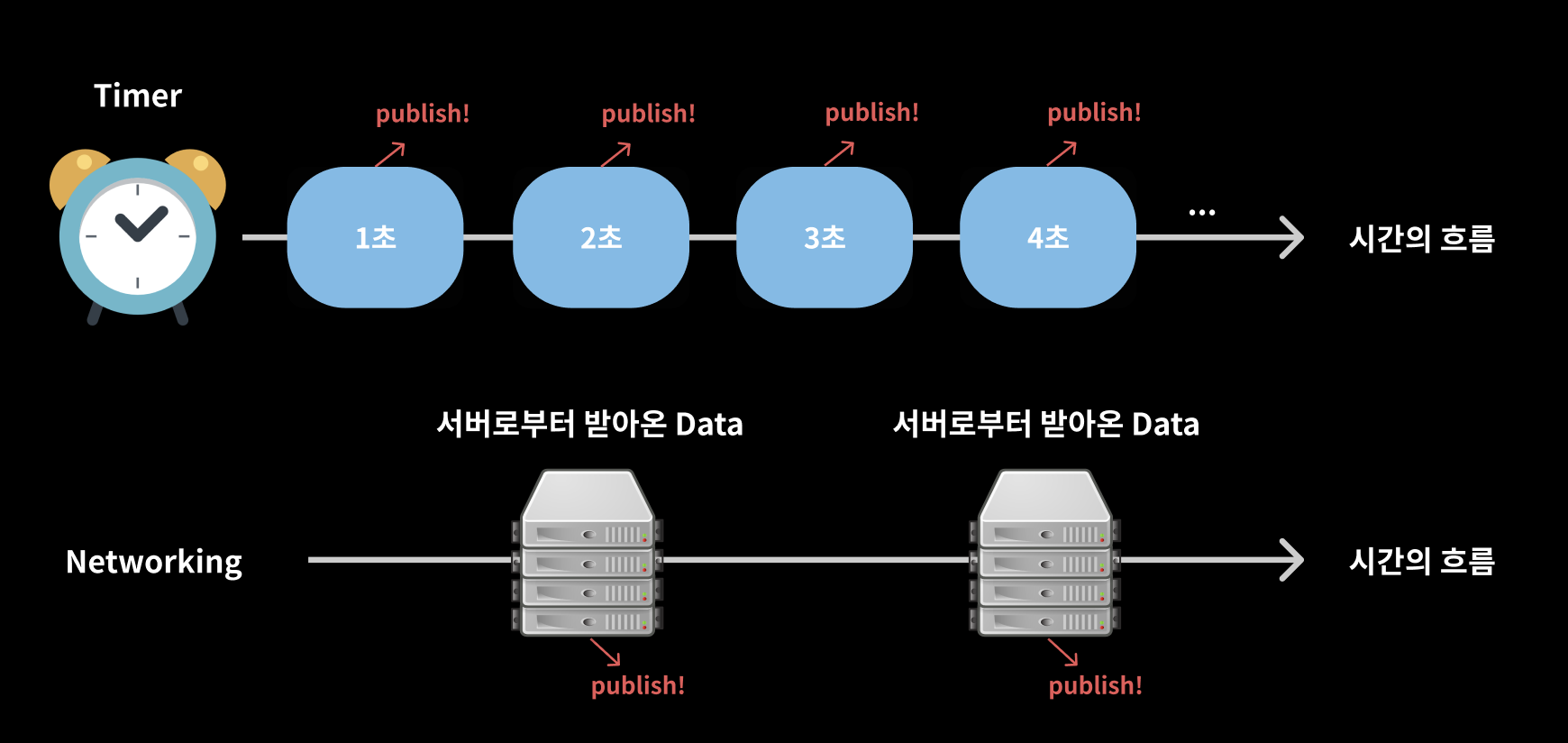이때 방출되는 값은 네트워크 통신과 같이 요청 직후의 딱 한 번일 수도 / 텍스트 필드나 타이머와 같이 지속적으로 이루어질 수도 있는데,