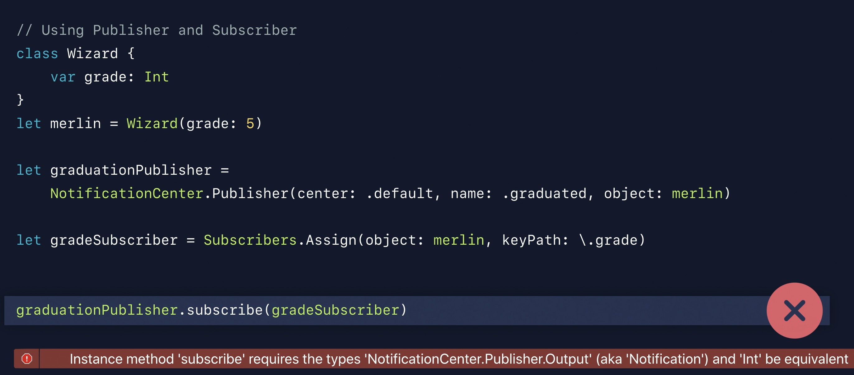 이때 아래 코드에서 보이는 것처럼, Publisher의 Output과 Subscriber의 Input이 일치하고, 상호 간 Failure 타입도 일치해야 subscribe(연결)를 할 수 있다는 것! (아마 Subscriber 부분에서 다시 한번 설명하게 될 거다.)