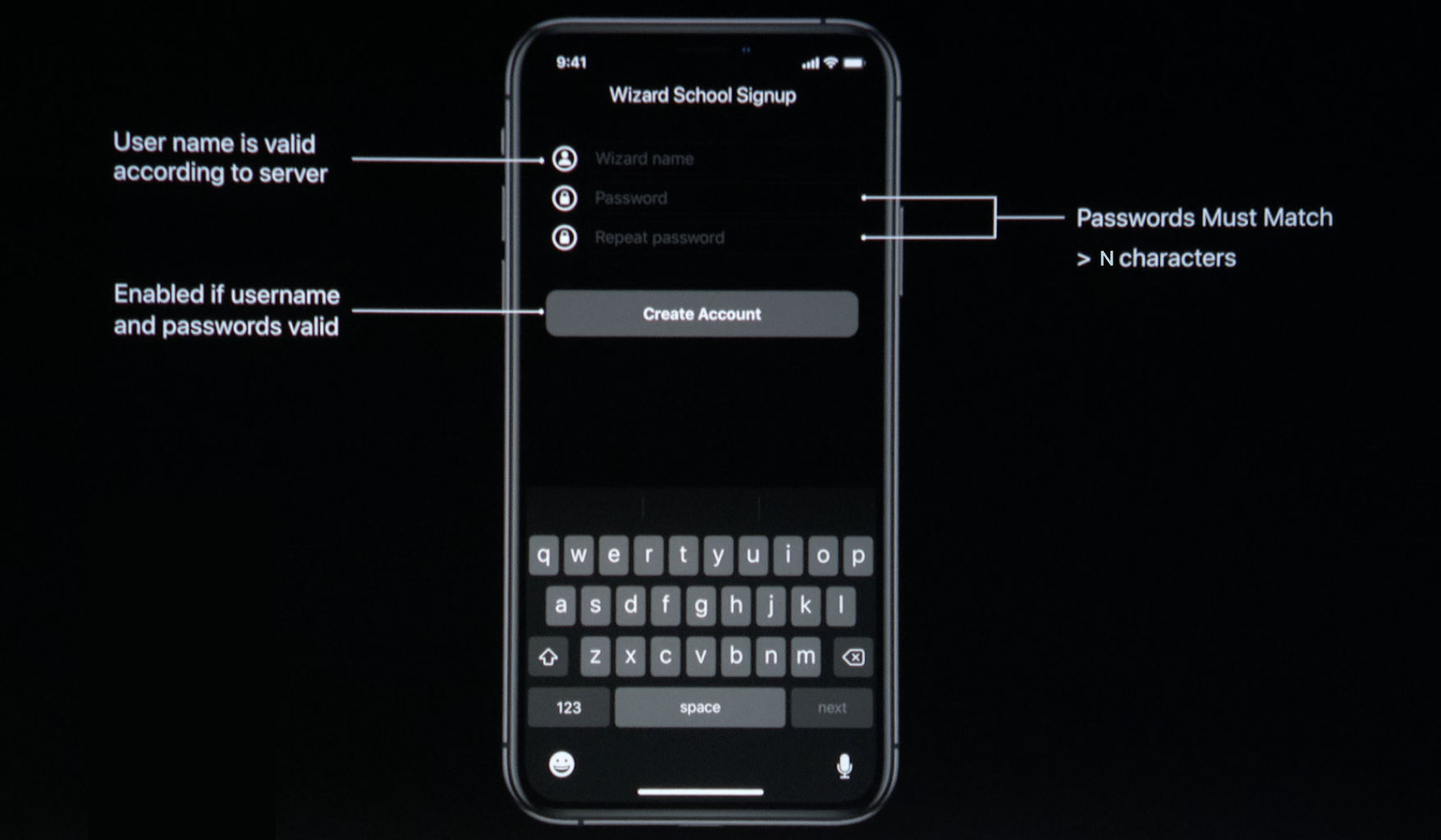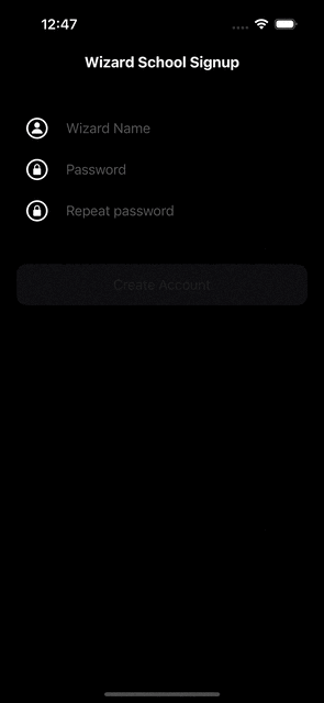 WWDC19에서 Combine을 처음 소개했을 때 사용했던 <Wizard School Signup>이라는 예제이고, (내가 직접 구현하면서 조금 수정했다) 사용자로부터 wizardName과 password, repeat password 값을 입력받아 비동기적으로 값의 유효성을 체크하고 User Interface의 변화를 주는 게 목표다.
