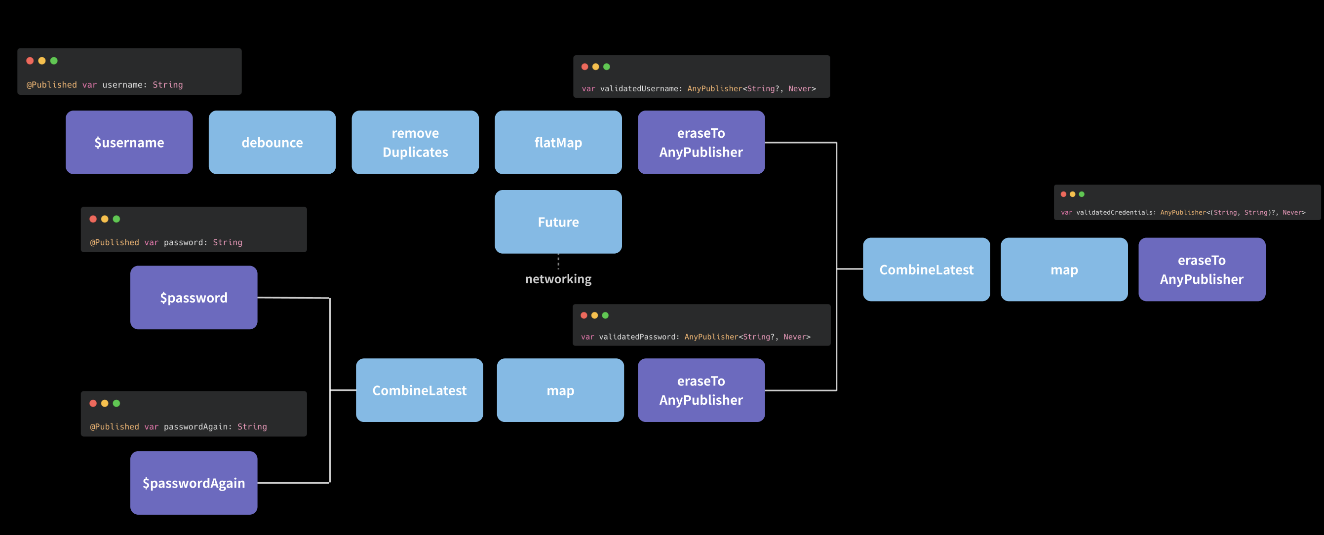 var validatedCredentials: AnyPublisher<(String, String)?, Never> {