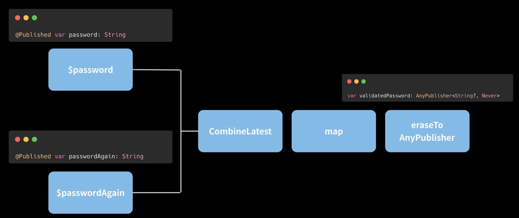첫 번째로 만들 녀석은 두 개의 @Published 프로퍼티 (password & passwordAgain)을 결합하고, 비밀번호의 유효성을 체크하는 조건 로직을 지나, 유효한 비밀번호 값을 publish 하는 AnyPublisher<String?, Never> 타입의 Publisher다.