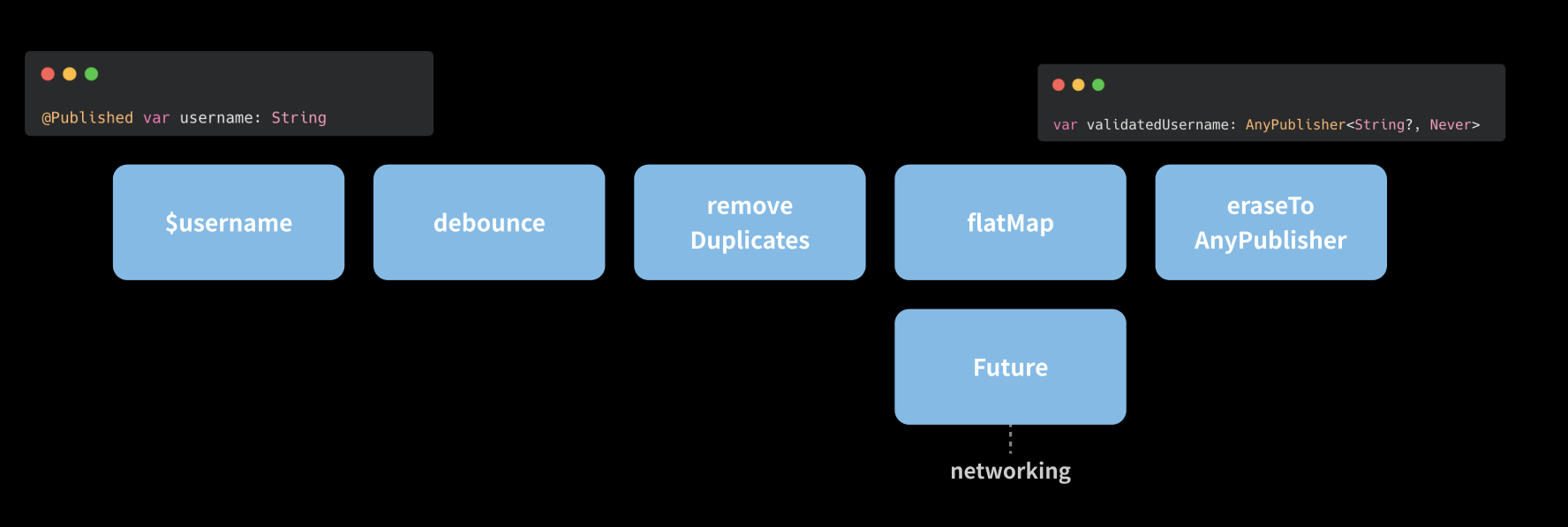 지금 선언한 validatedUsername Publisher는 텍스트 필드의 text 값이 변경될 때마다 방출되는 @Published var username 프로퍼티로부터 값을 받아 ($username 사용) - 네트워크 통신을 보내 유효성을 검증하고 - 검증된 username 값을 보내도록 로직이 만들어졌다.