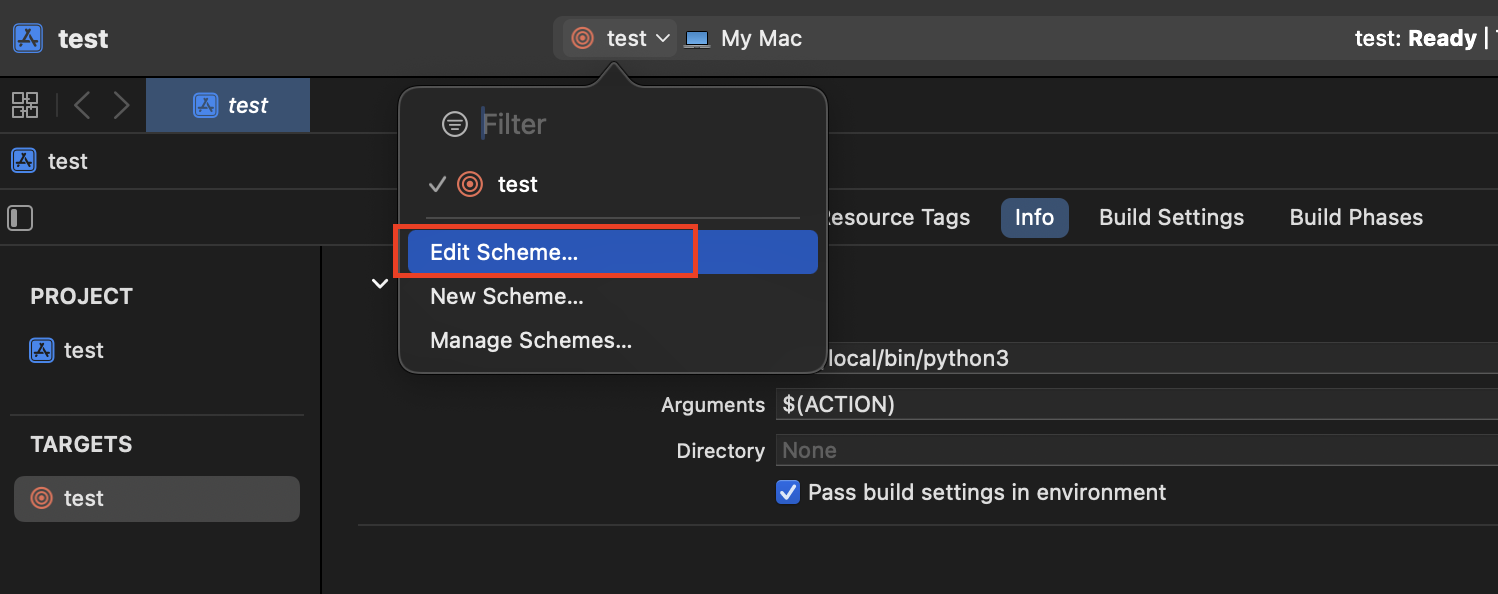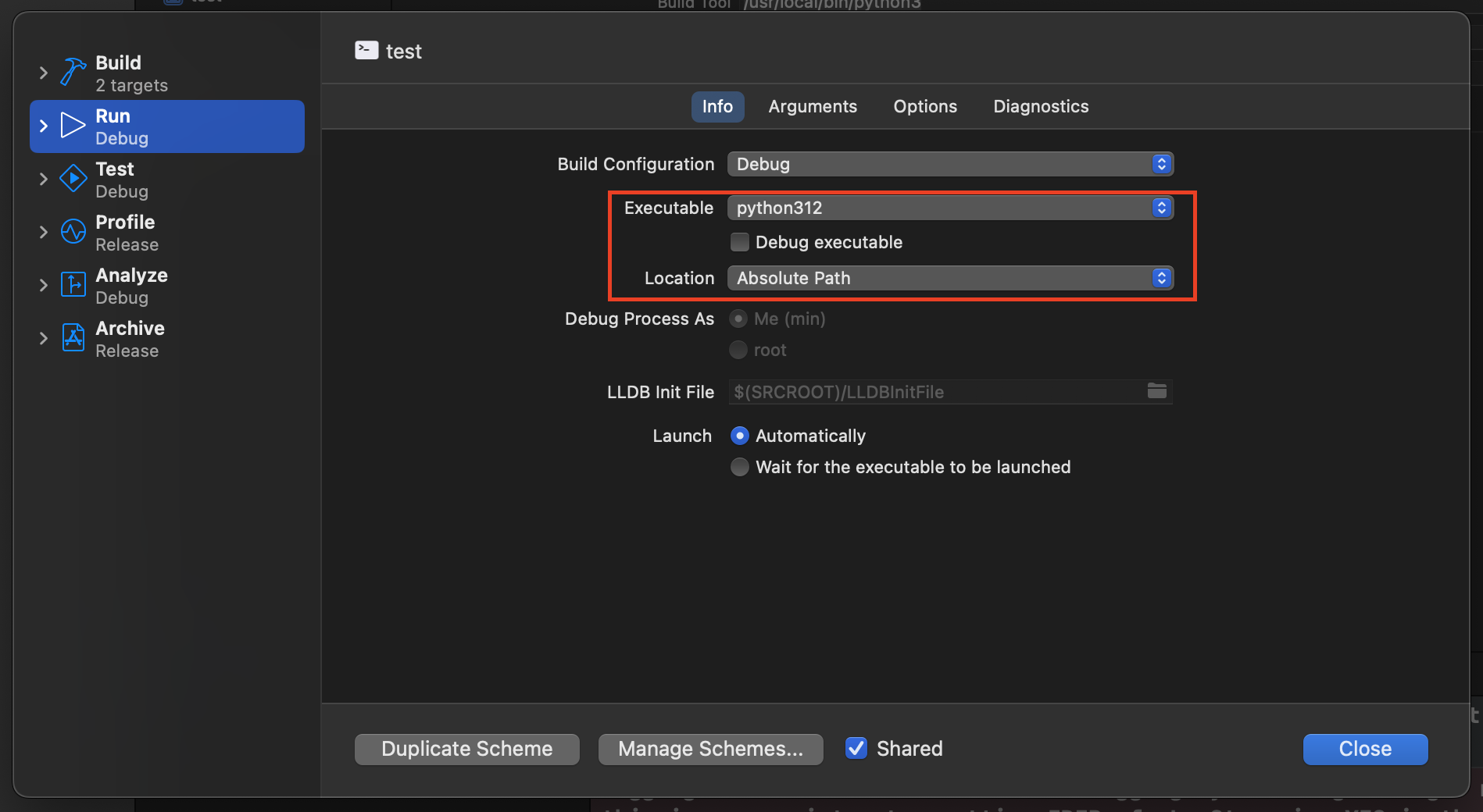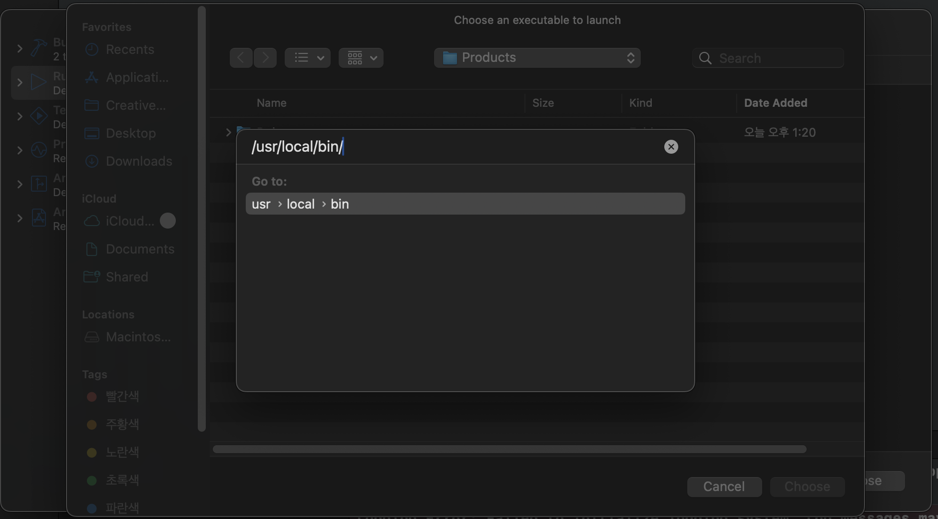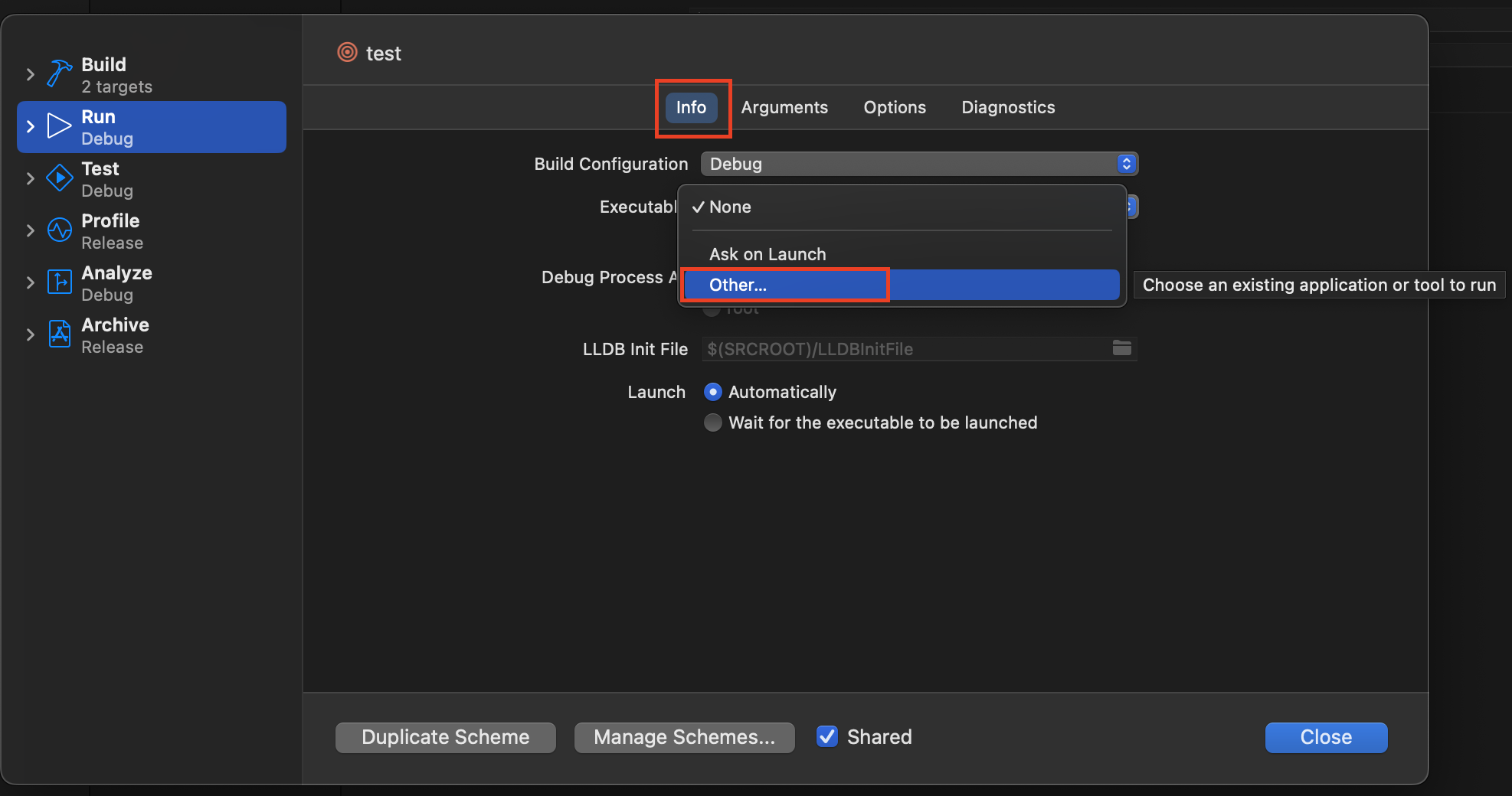 4. Xcode 상단의 "Edit Scheme 메뉴 접근-Info-Executable-Other" 클릭해서 실행 파일 지정하는 곳으로 진입하자.