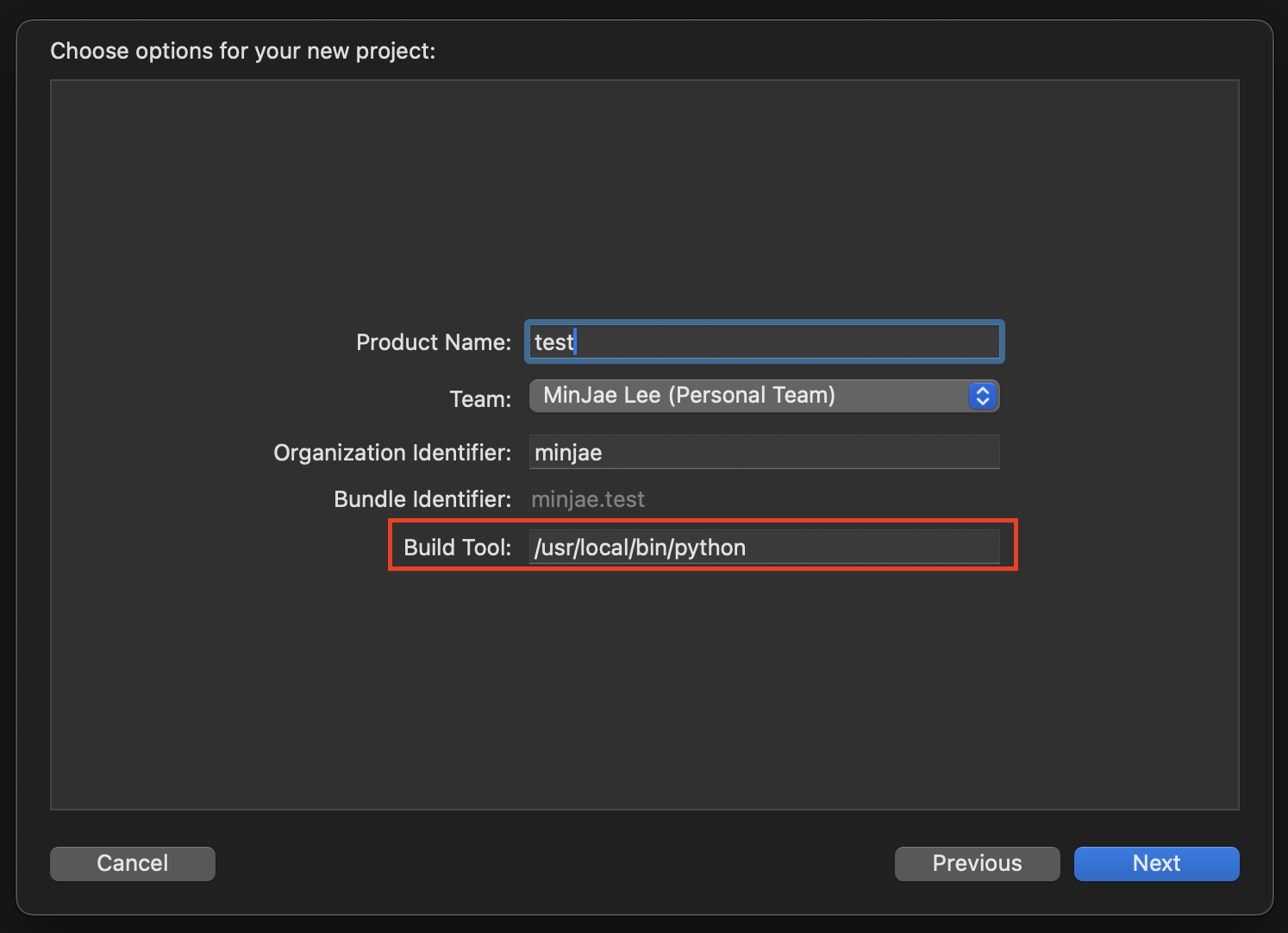 2. Product Name을 설정하고, python이 위치한 경로를 Build Tool로 지정해 주자.