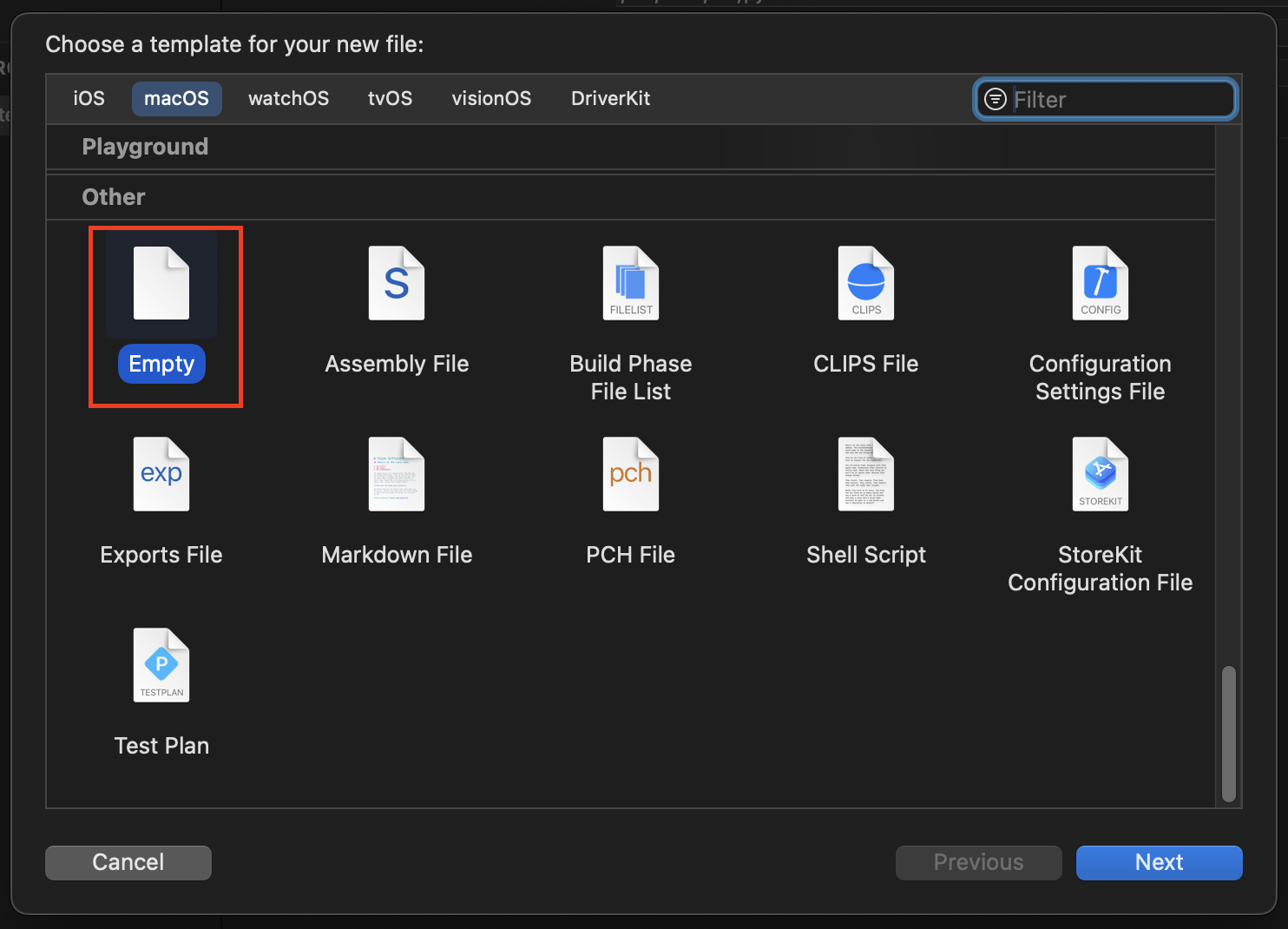3. 테스트하고 싶은 파이썬 파일(.py)을 "macOS-Empty" 타입으로 생성한다.