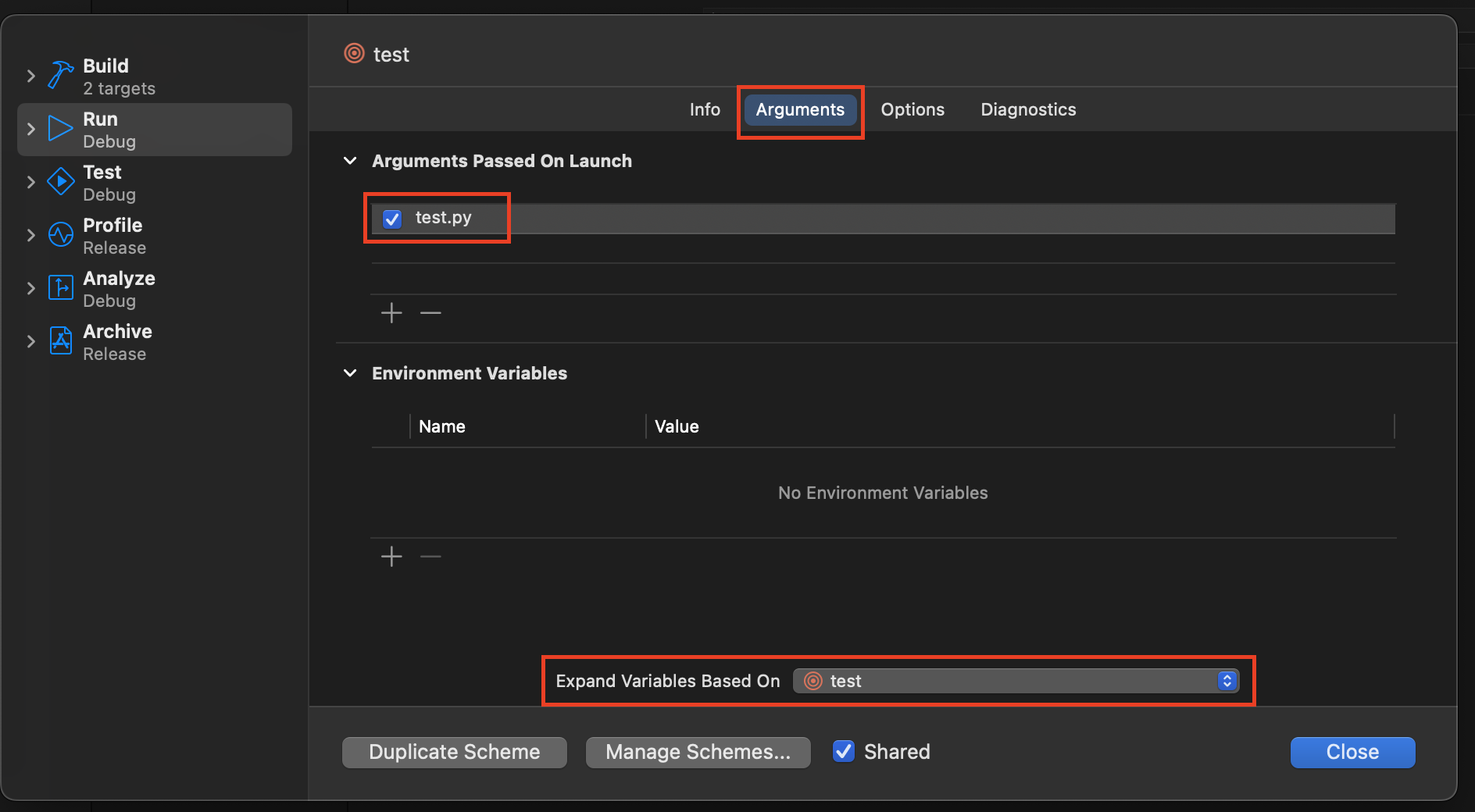 6-1. Edit Scheme 메뉴의 Argument 탭에 들어가서 Arguments Passed On Launch 항목에 (2)번에서 만들었던 (빌드시키고자 하는) 파이썬 파일(.py)을 추가한다.
