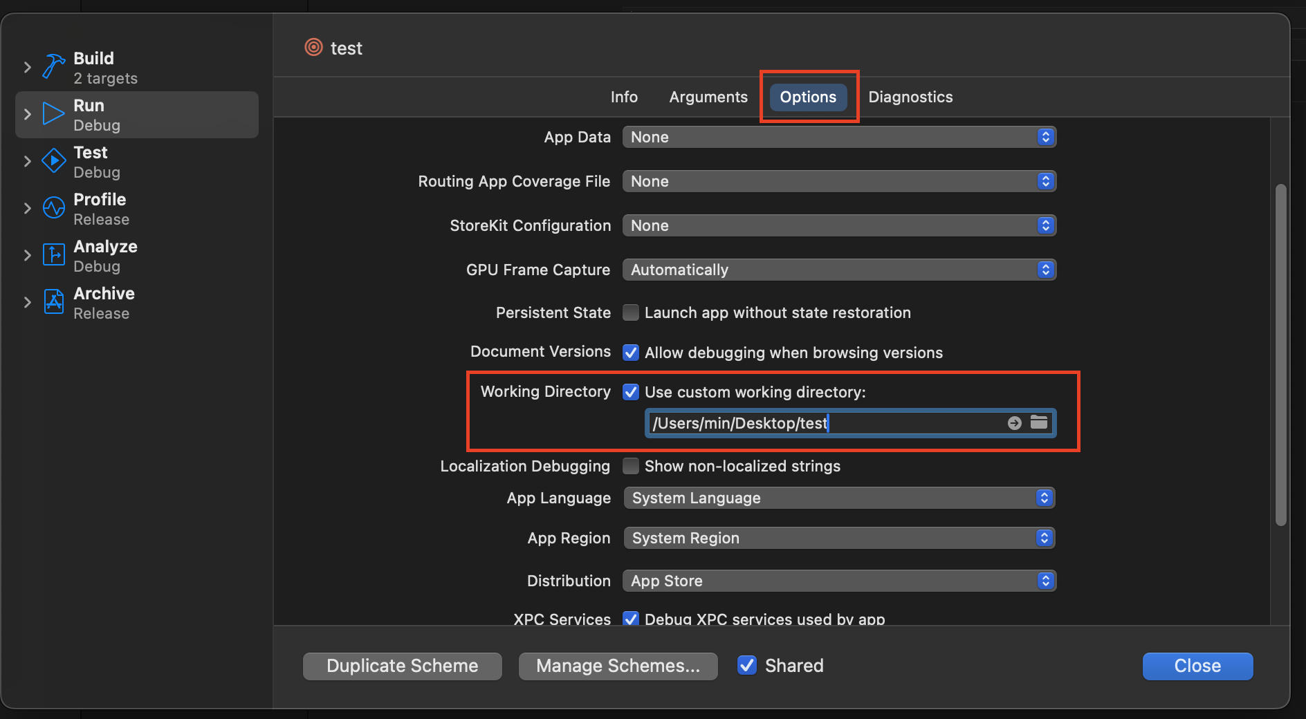 7-2. Working Directory에 현재 프로젝트 (.xcodeproj 파일을 포함하고 있는) 경로를 지정한다.