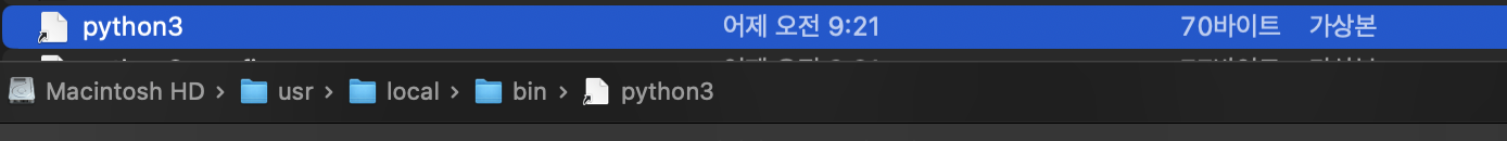 💡 Python이 위치한 경로는 터미널에 where python3 명령어를 입력해서 확인할 수 있다.