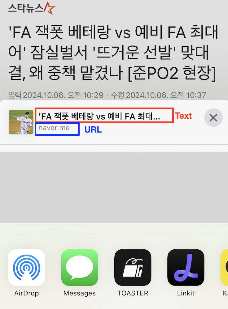하지만, 네이버 기반의 앱에서는 아래 보이는 것과 같이 Text와 URL이 함께 넘어오거나, Text만 가지고 넘겨주는 경우가 있어