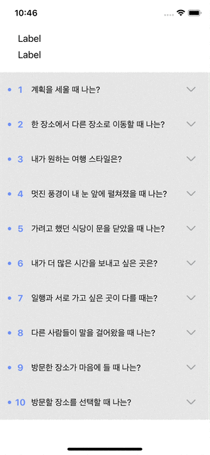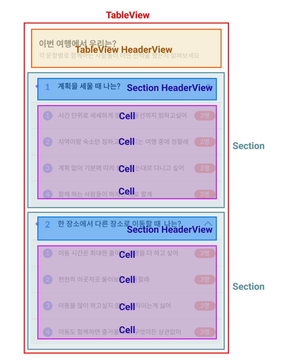 우선, 크게는 TableView를 사용하면서 "이번 여행에서 우리는?"이라 써있는 상단 고정 뷰를 TableView의 header로 설정했다.