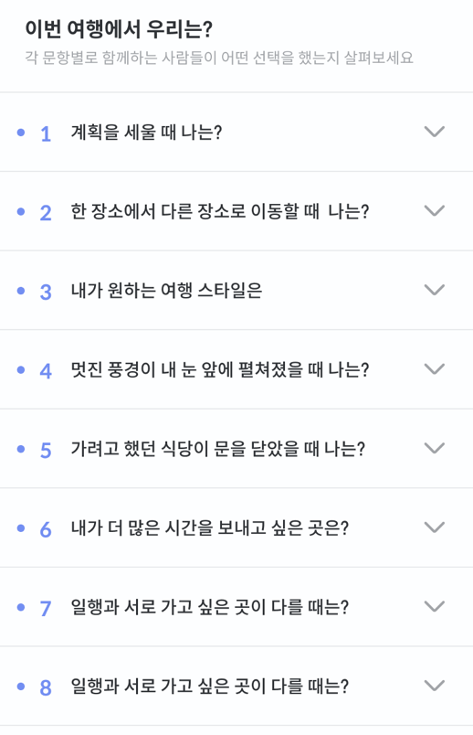 같이 여행을 가는 구성원들끼리 성향 테스트 결과를 각 문항마다 확인할 수 있는 뷰였는데,
