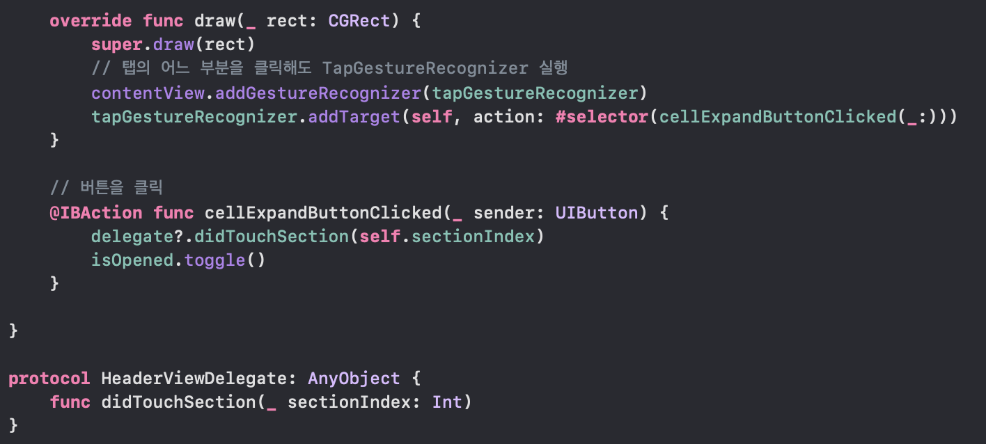 해당 sectionIndex(위치)에 따라서, isOpen을 조건으로 나누어 insertRows, deleteRows를 활용하는 방식으로 자세한 기능을 구현했다 ^__^