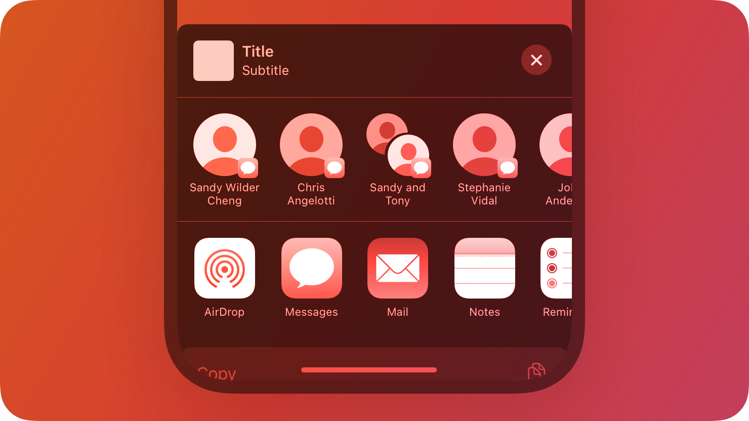 An activity view — often called a share sheet — presents a range of tasks that people can perform in the current context.