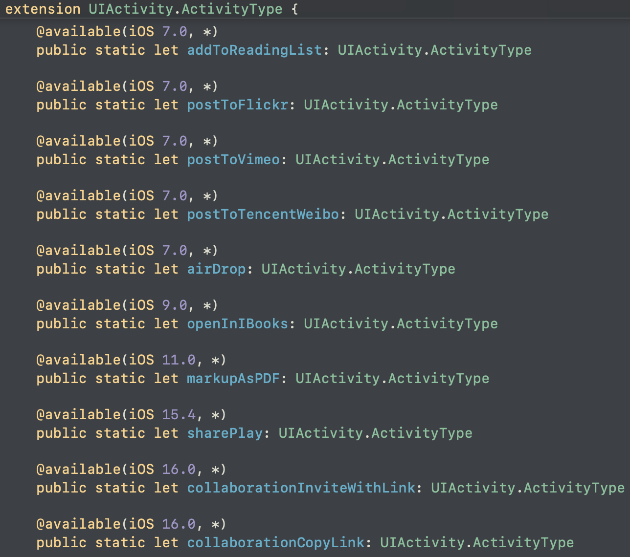 지울 수 있는 항목은 UIActivity.ActivityType에서 직접 확인할 수 있습니다.
