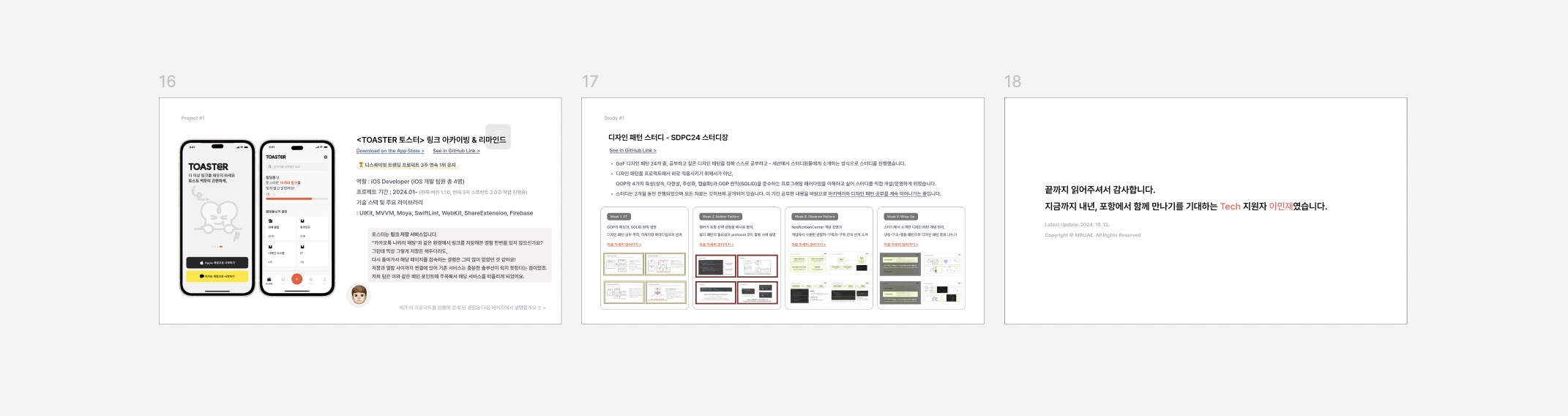 테크 분야로 지원한 저 같은 경우에는 일반적인 기업 제출용 포트폴리오처럼 새로 도입한 기술과 개선사항, 성능적 지표를 담기보다 / 해당 프로젝트, 스터디, 활동 등을 통해 배우고 느낀 점을 중심으로 담고자 했습니다!
