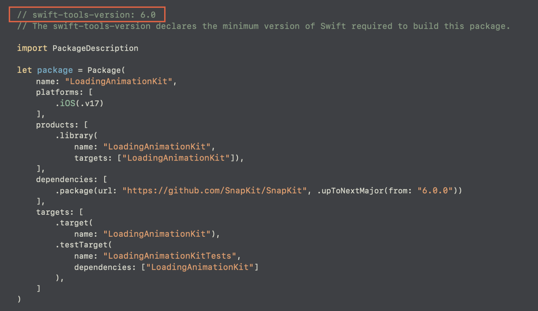 swift-tools-version: 버전의 형태로 파일 가장 상단 부분에 주석의 형태로 서있는 것은 해당 패키지를 빌드하기 위해 Swift Compiler가 요구하는 minimum 버전을 명시하는 것으로, SPM이 사용하는 버전이라고 생각하면 됩니다.