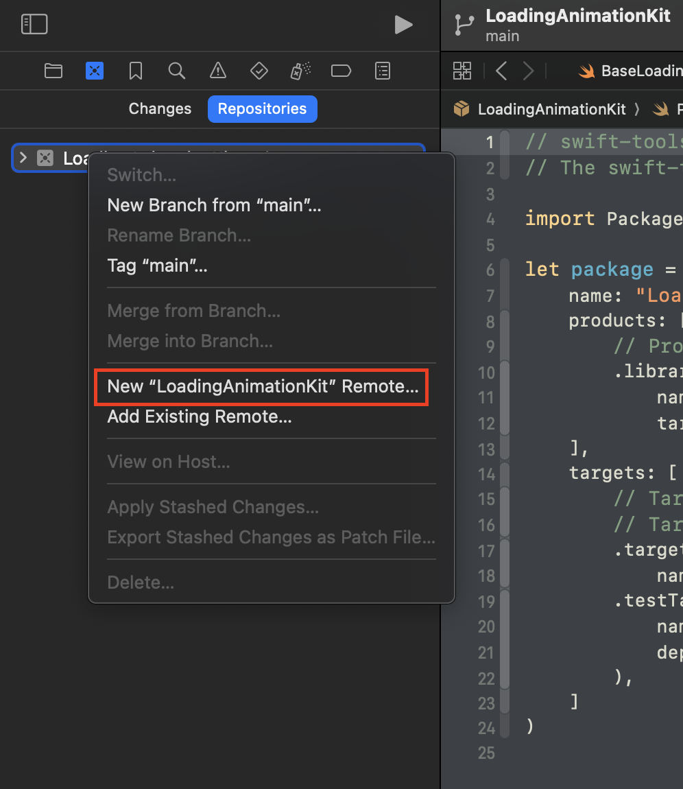 Repository를 우측키로 접근하면, New "설정한 Package 이름" Remote... 버튼을 눌러 생성창을 띄워줄게요!