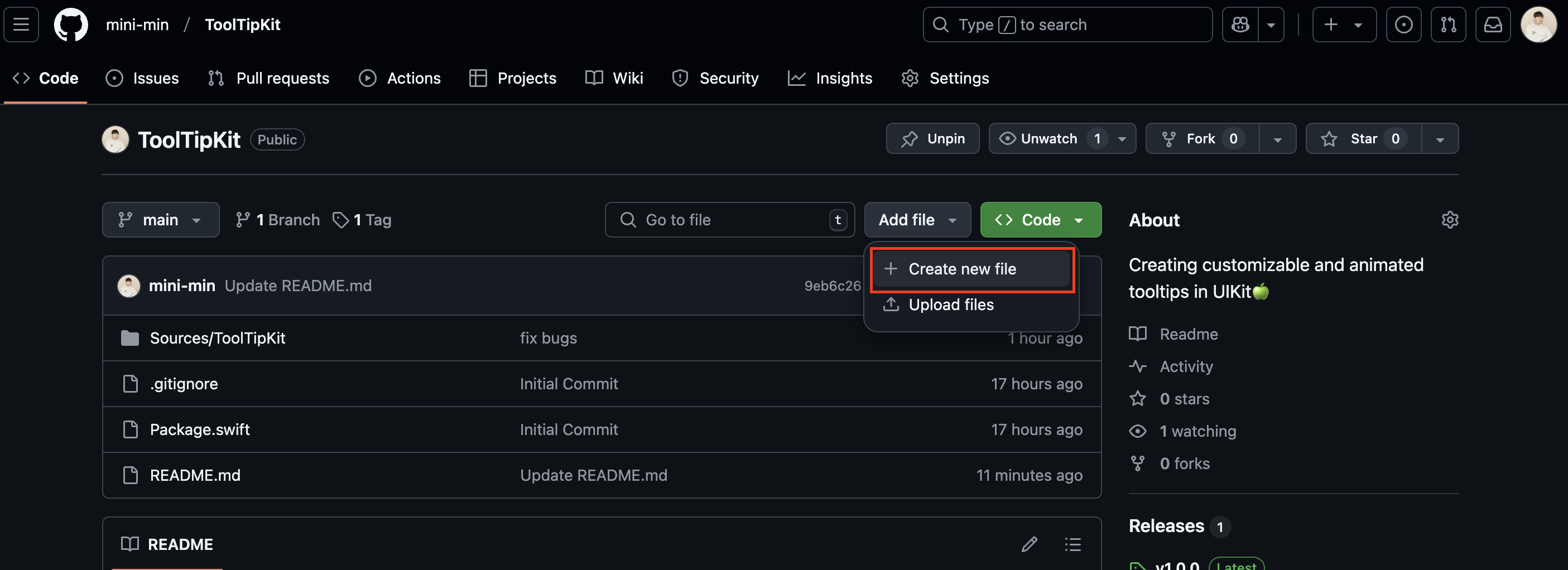 우선, 라이선스를 추가하고자 하는 레포에 Add file -> Create new file을 순서대로 눌러주세요.
