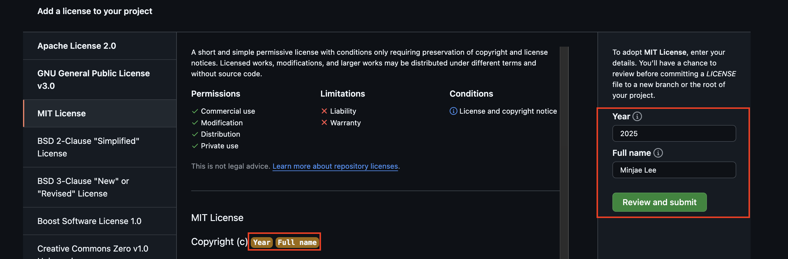 MIT는 추가적으로 Year와 Full name이 필요해 입력해줘야 했고, 이후 Review and submit 버튼을 눌러 다음 단계로 넘어가볼게요!