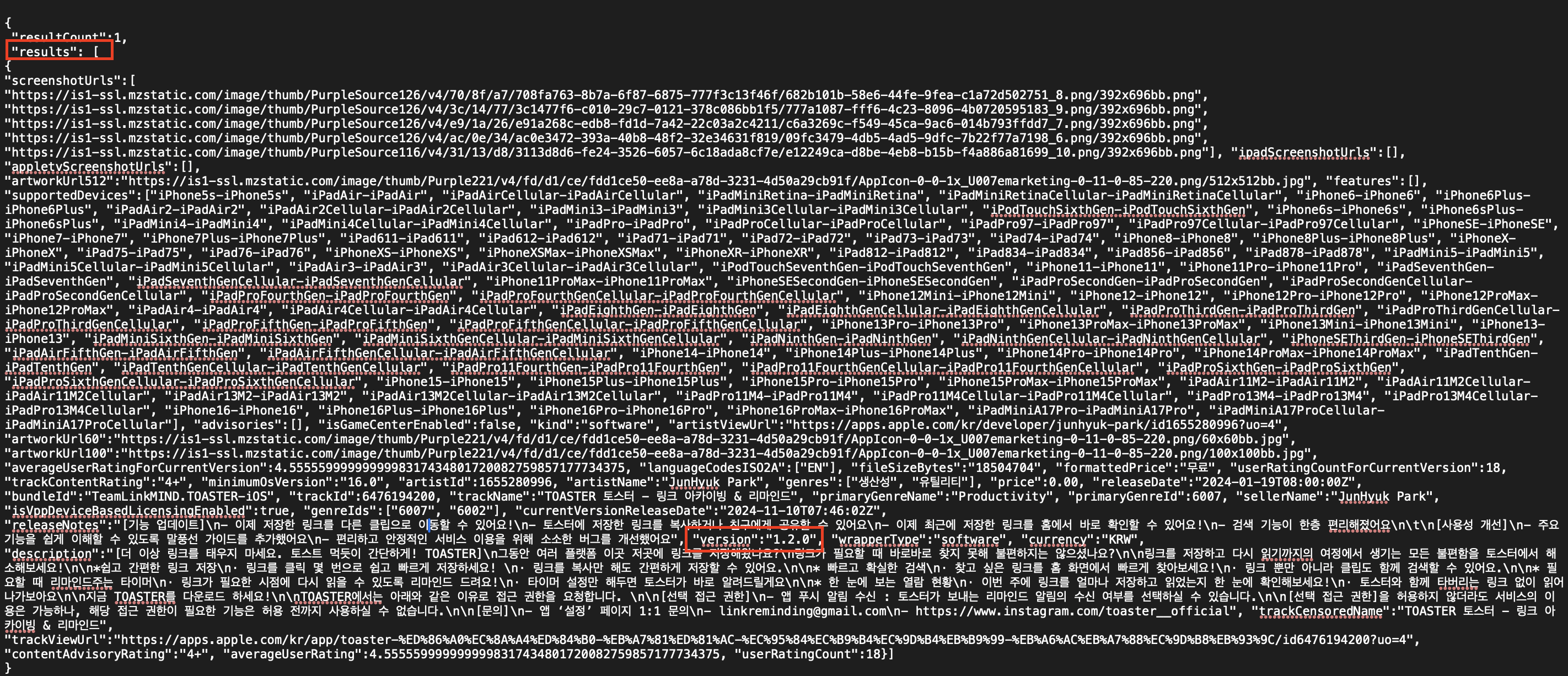 이 값을 사용해 현재 App Store에 올라와 있는 애플리케이션에 대한 정보를 가져올 수 있어요! (업데이트 이후, 정보가 최신화되기까지는 하루이틀 정도 소요되는 듯해요.)