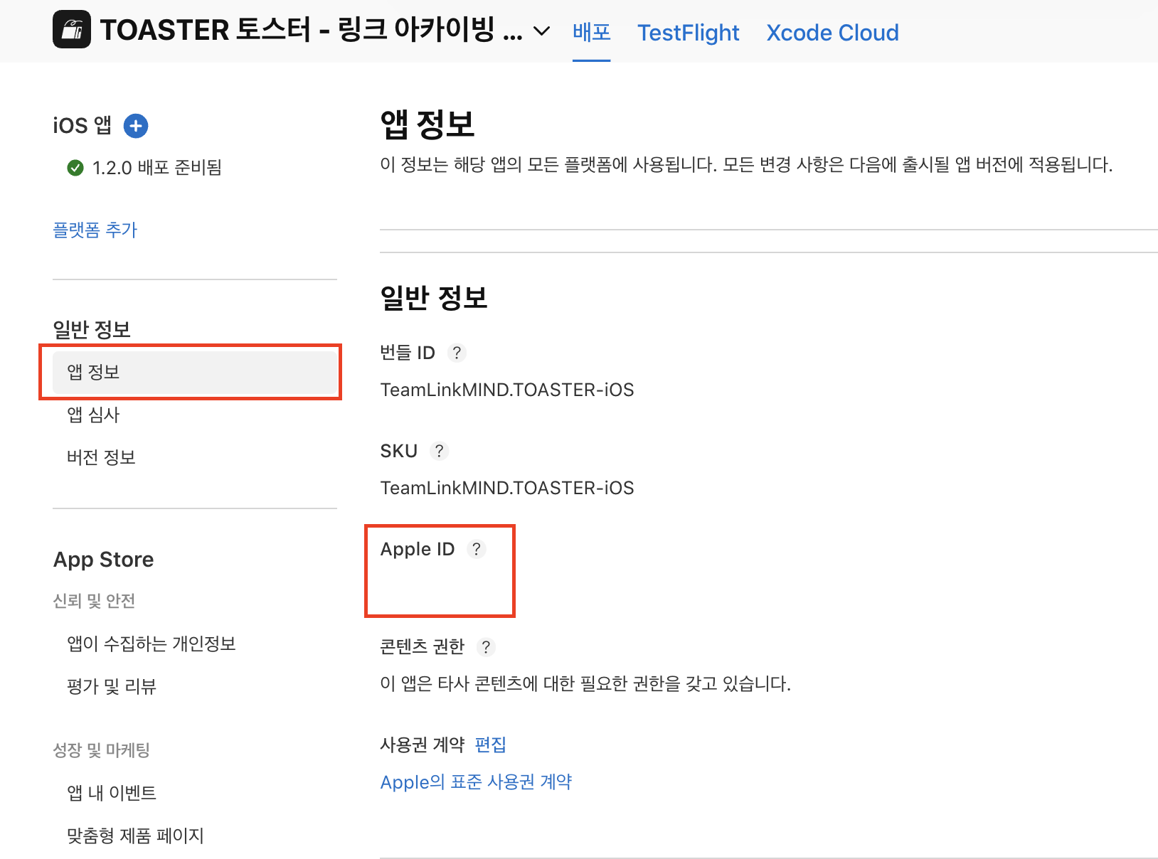 [App Store Connect - 앱 정보 - Apple ID 값]에 자동으로 부여된 고유한 앱 ID 값을 의미합니다.