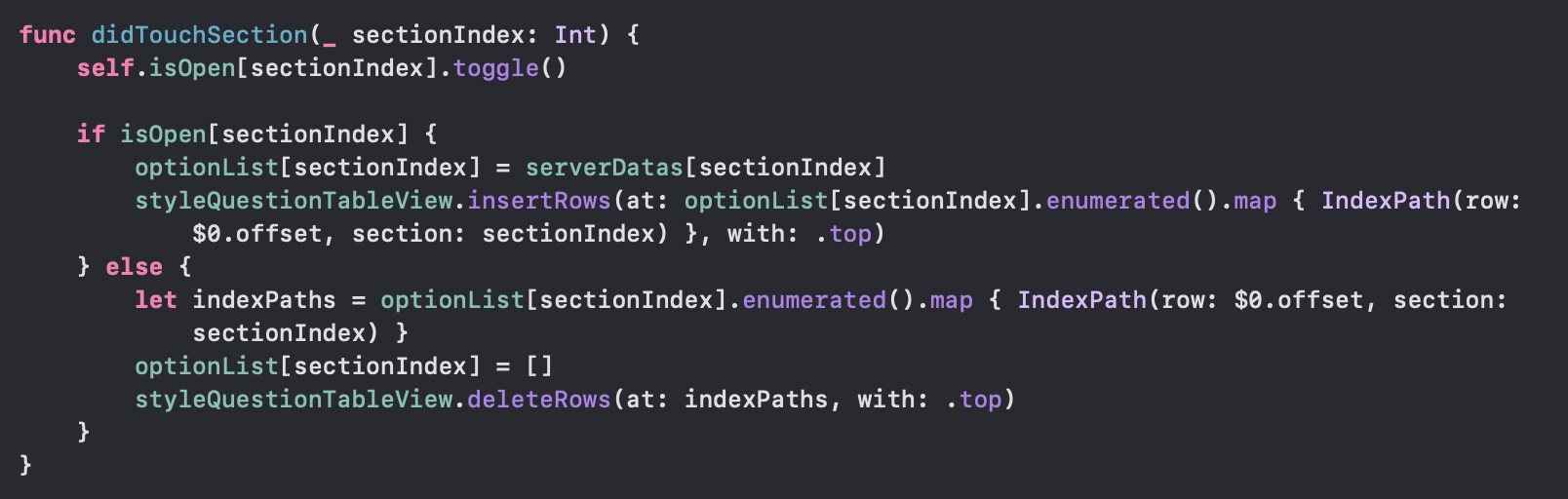 해당 sectionIndex(위치)에 따라서, isOpen을 조건으로 나누어 insertRows, deleteRows를 활용하는 방식으로 자세한 기능을 구현했다 ^__^