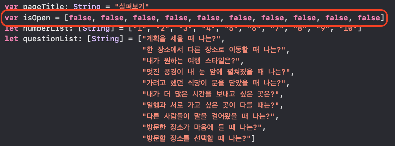 이번 화면도 예외가 아니었는데, 아래처럼 isOpen이라는 Bool값을 담을 수 있는 배열을 선언했다.