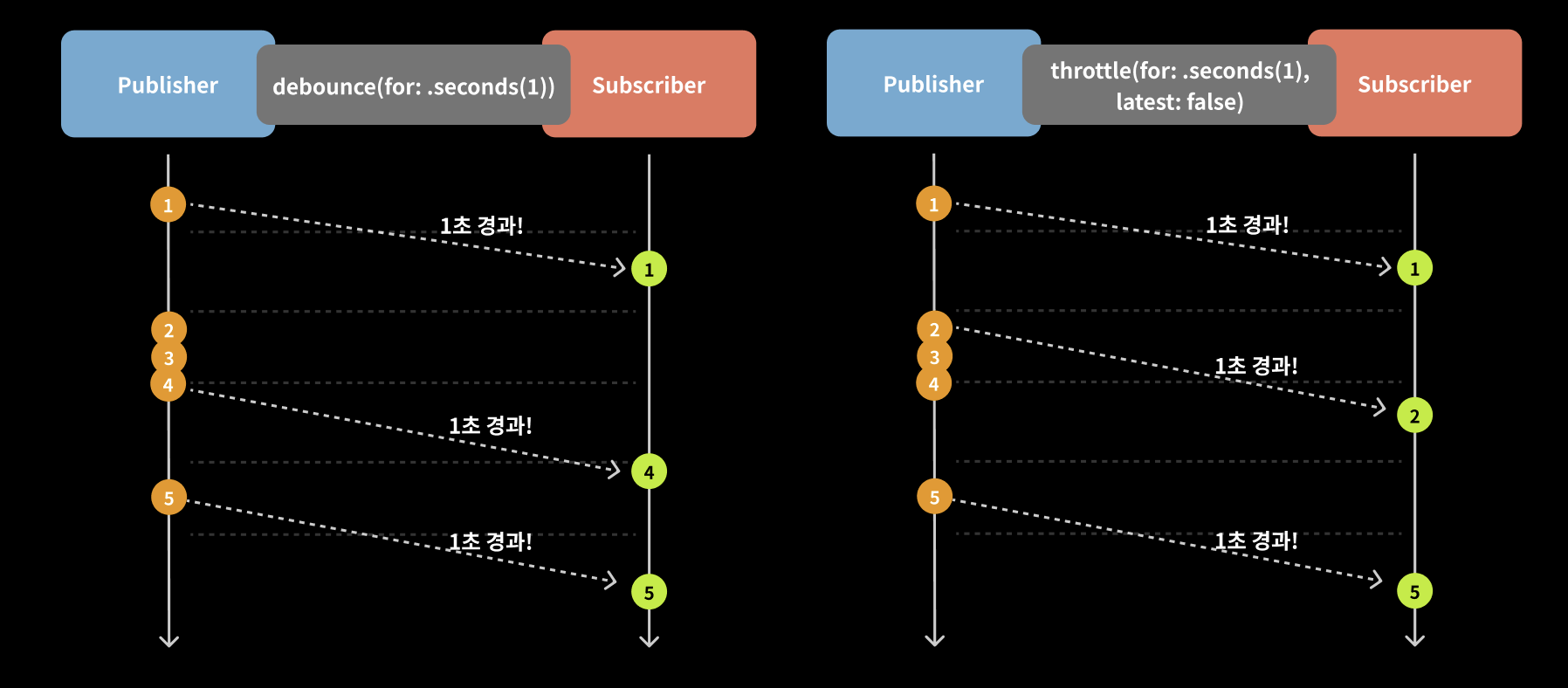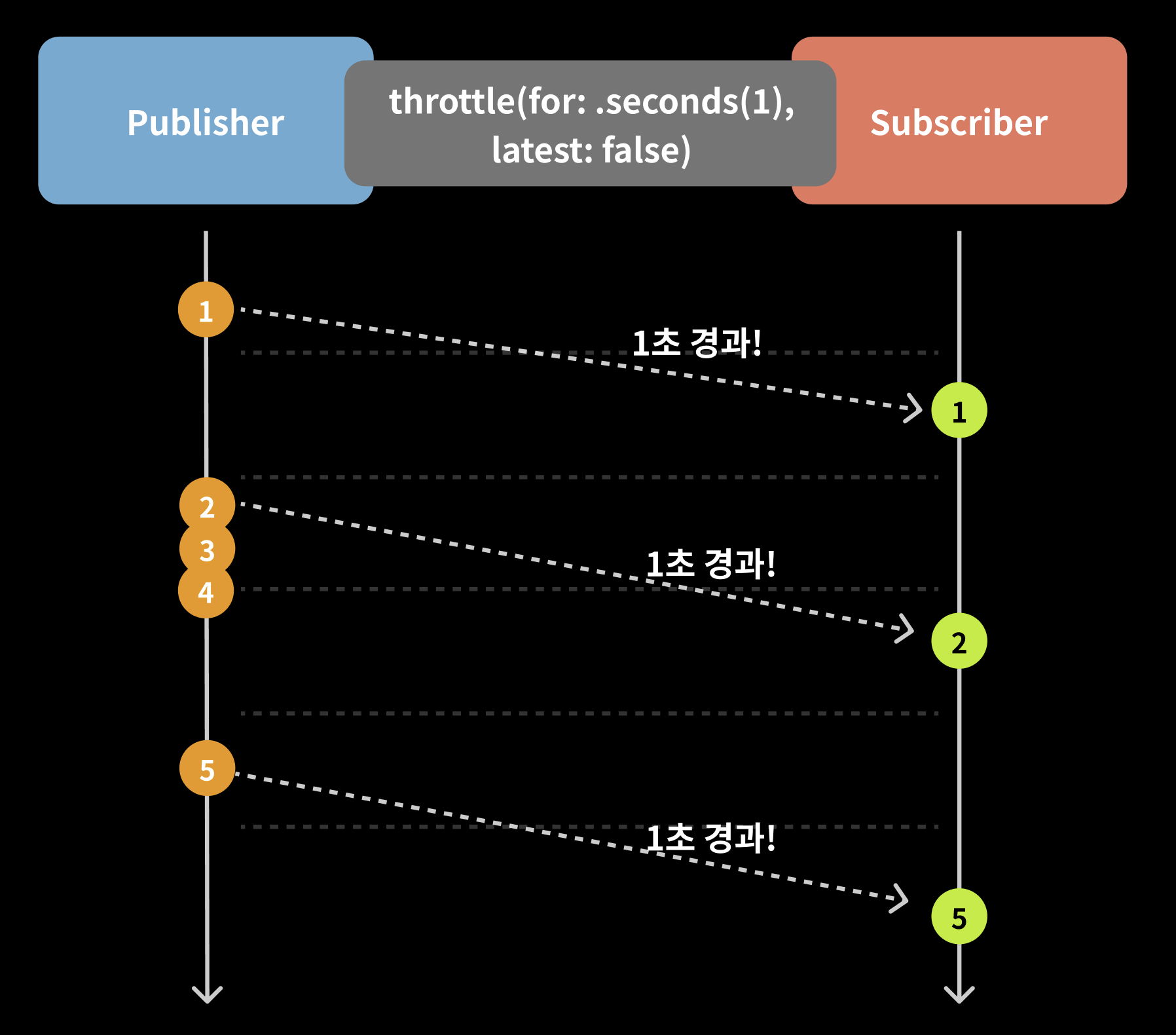 ✔️ throttle : 지정된 시간동안 Upstream Publisher에서 값이 연속 방출되더라도, 처음 또는 마지막으로 방출된 값만을 Publish함.