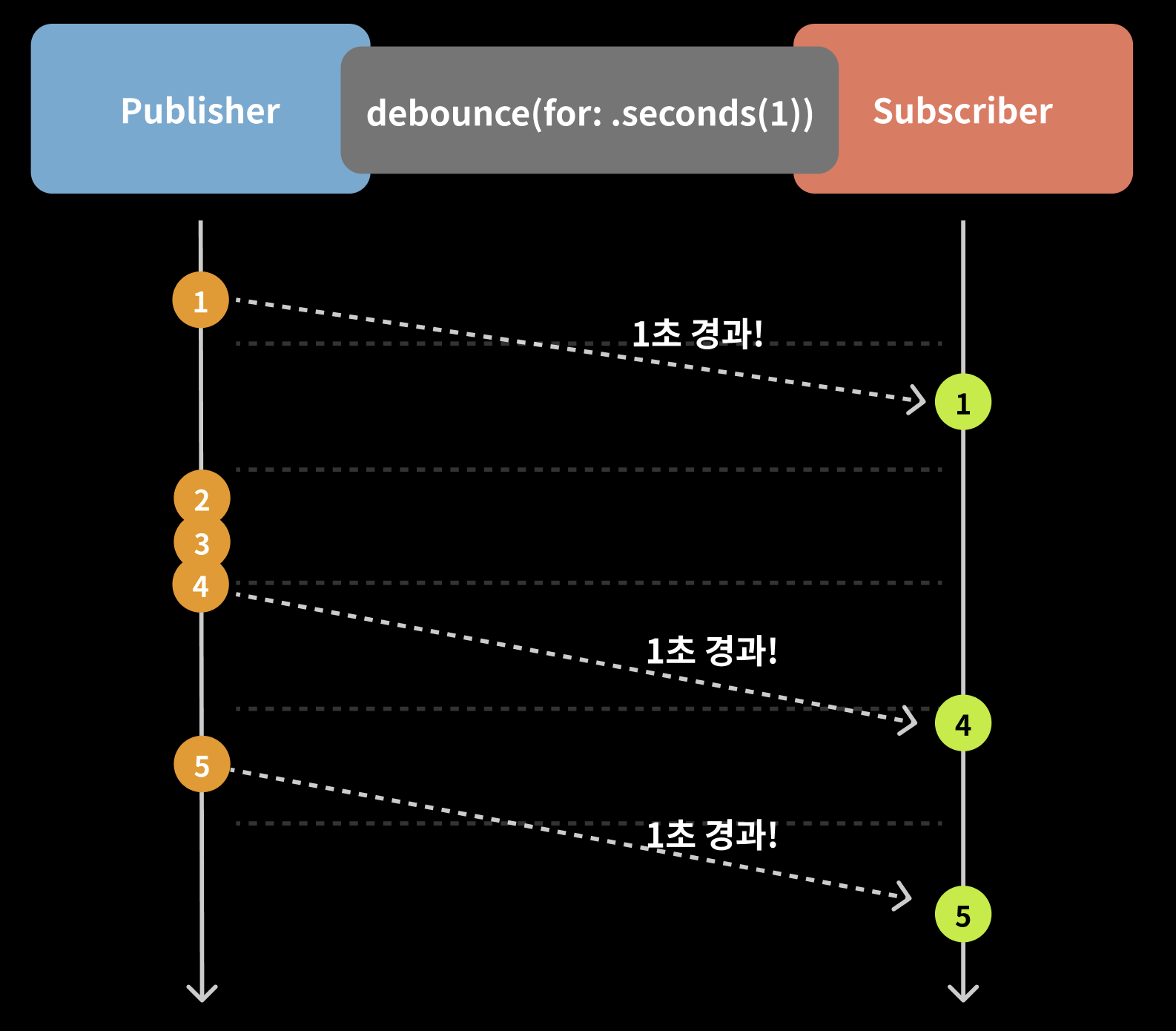 ✔️ debounce : Upstream Publisher에서 일정 시간동안 값이 방출되지 않을 때, 마지막 값을 Publish함.