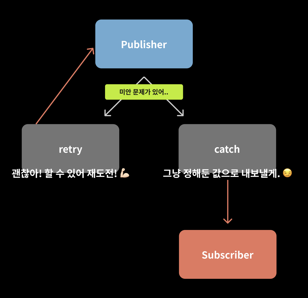 Upstream Publisher로부터 에러가 발생했을 때, 이를 처리할 수 있는 Operator는 retry와 catch가 있습니다.