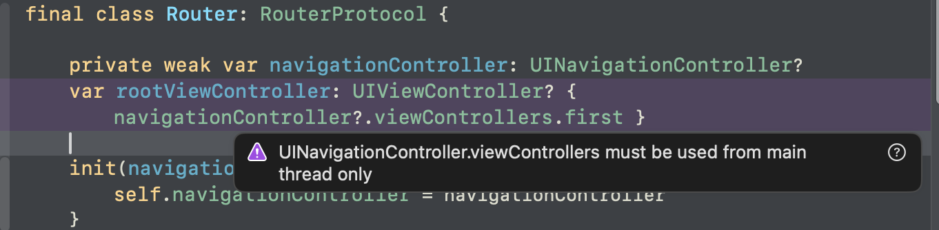 UIView, UINavigationController 등 UI, 즉 화면을 담당하는 객체 관련 코드가 메인 스레드가 아닌 다른 스레드 접근을 시도할 경우에