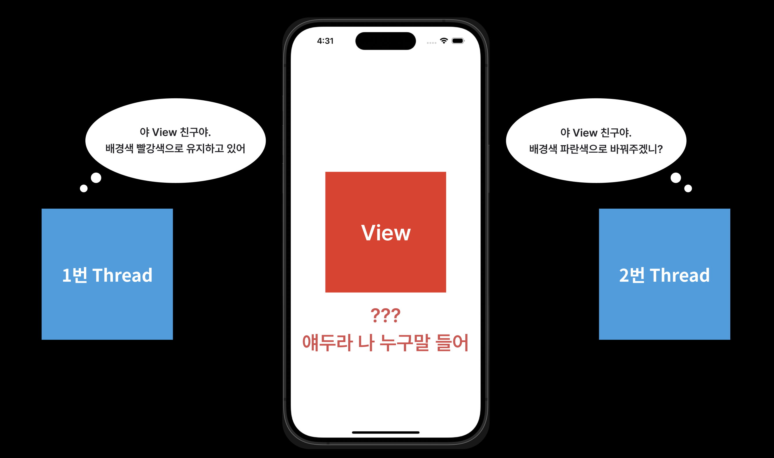이런 경우에, UIKit 혹은 SwiftUI의 View는 어떤 스레드의 명령을 들어야 할지 혼란에 빠지게 될 거예요.