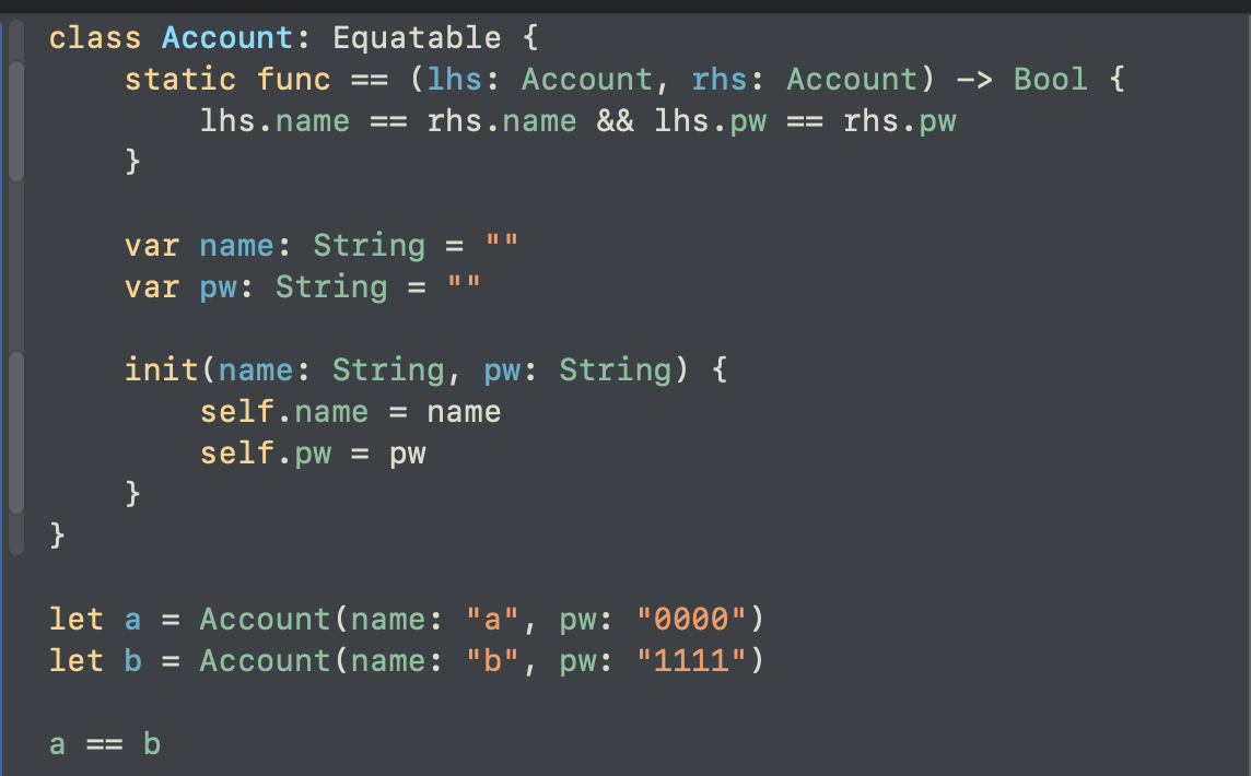 - Equatable은 값이 동일한지? 값이 다른지?를 비교하기 위해 채택할 수 있는 프로토콜이다.