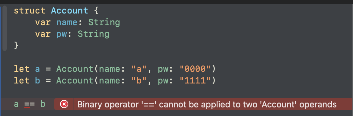 아래와 같이 Binary operator '==' cannot be applied to two 'Account' operands라는 에러가 발생하고 있었는데요.