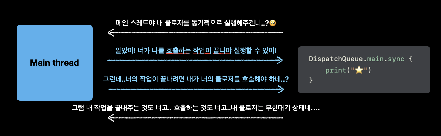 문제는 메인큐에 동기 작업을 호출한 것 자체가 아니라, "메인 스레드에서 메인큐에 동기 작업을 덧붙여 호출한 것"이었거든요.