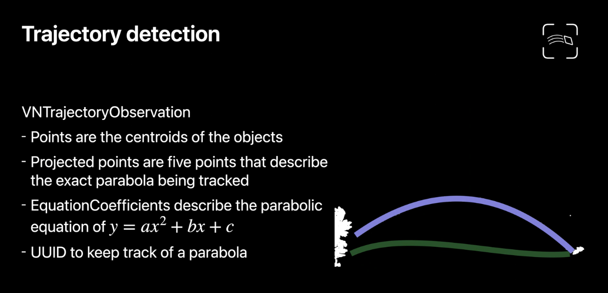 주로 연속된 프레임을 분석하기 때문에 Array로 제공되고 / 각 궤적마다, 궤적에서 감지된 중심점 detectedPoints, 포물선 근사에 사용된 경로점 projectedPoints, 포물선 방정식의 개수 equationCoefficients, 평균 이동 반경 movingAverageRadius 값 등을 받을 수 있습니다.