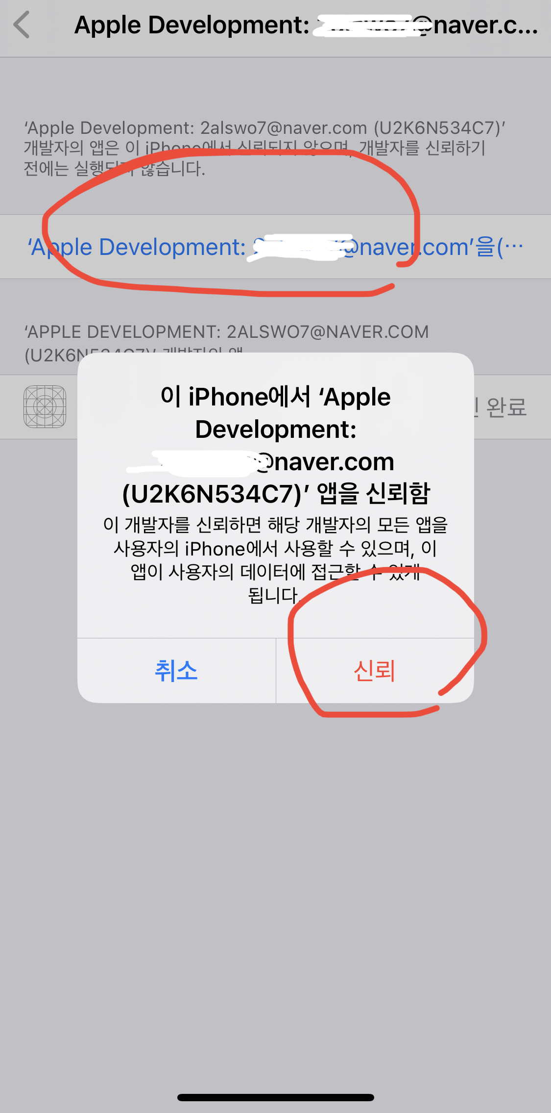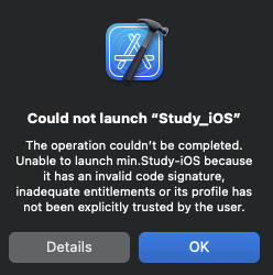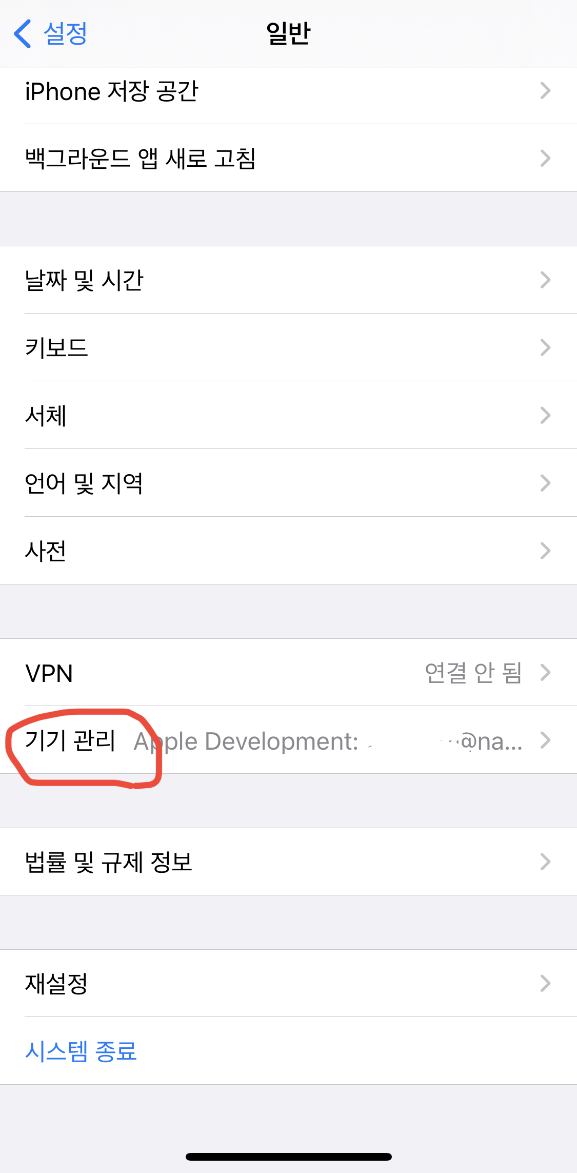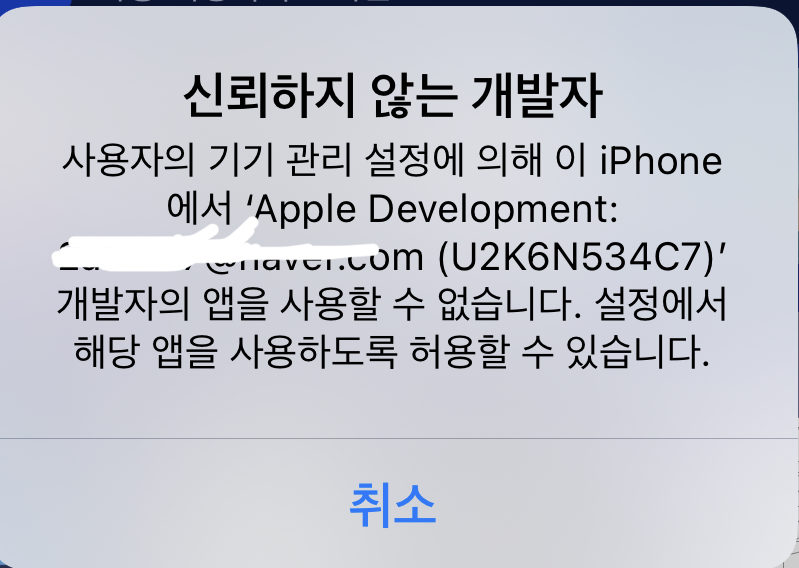 이럴 때는 당황하지 말고 "설정 -> 일반 -> 기기 관리 -> 개발자 앱 -> 신뢰함"을 따르자.